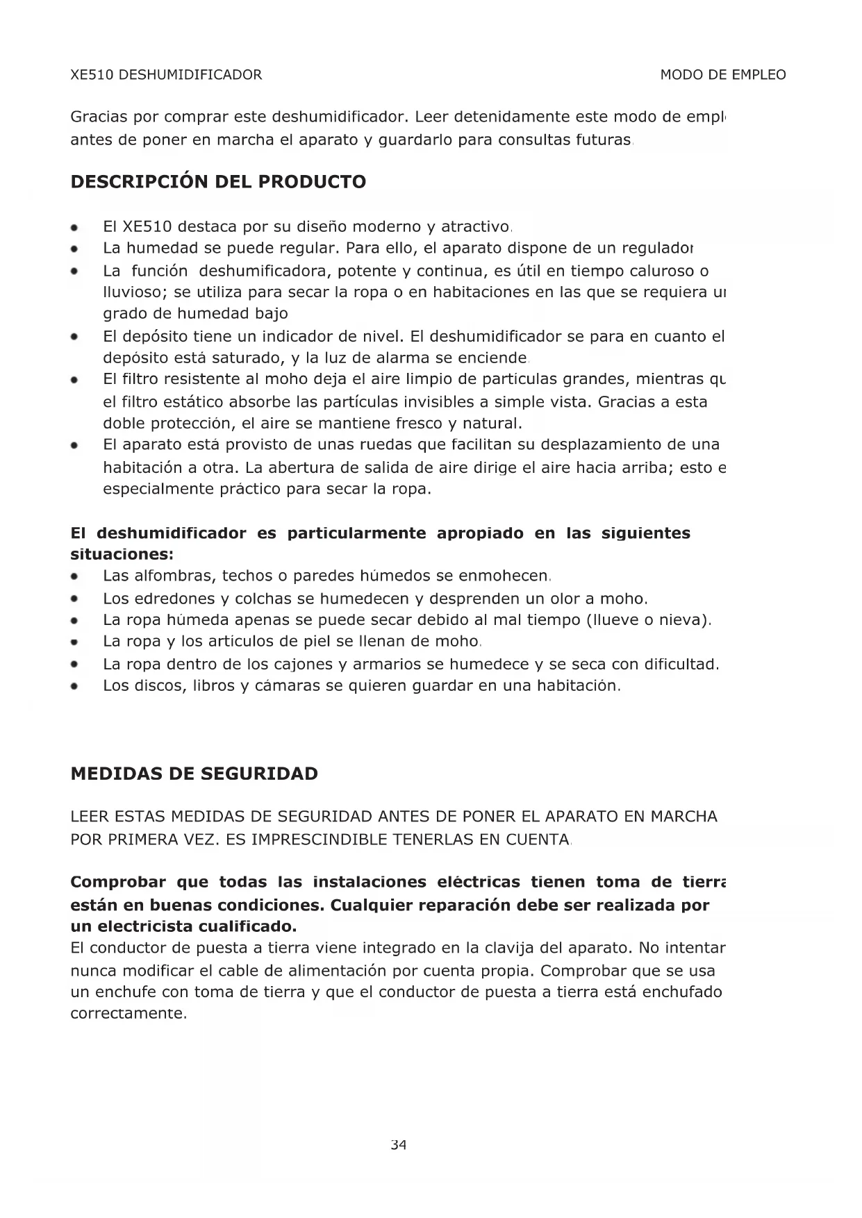 LEER ESTAS MEDIDAS DE SEGURIDAD ANTES DE PONER EL APARATO EN MARCHA POR PRIMERA VEZ. ES IMPRESCINDIBLE TENERLAS EN CUENTA. Comprobar que todas las instalaciones eléctricas tienen toma de tierra y están en buenas condiciones. Cualquier reparación debe ser realizada por un electricista cualificado. El conductor de puesta a tierra viene integrado en la clavija del aparato. No intentar nunca modificar el cable de alimentación por cuenta propia. Comprobar que se usa un enchufe con toma de tierra y que el conductor de puesta a tierra está enchufado correctamente. XE510 DESHUMIDIFICADOR