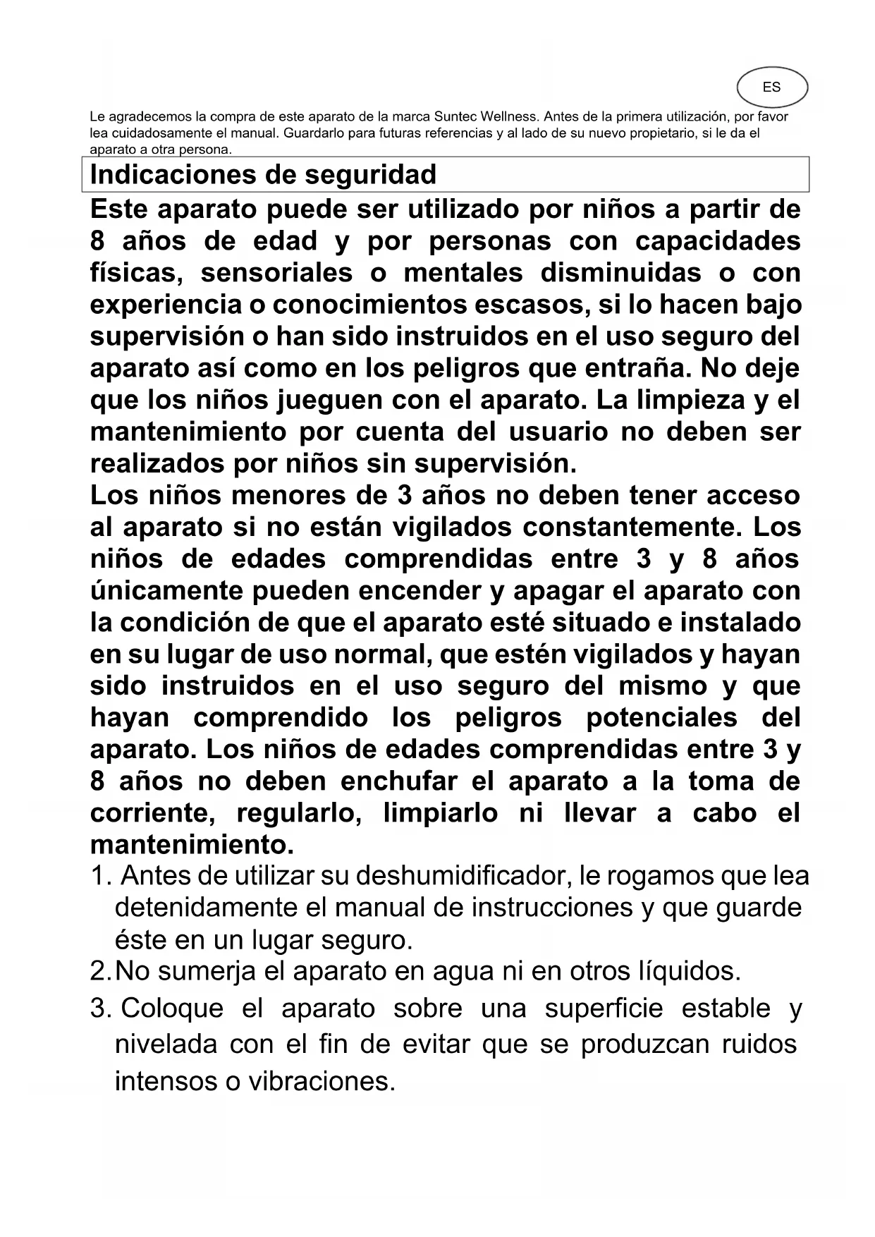 DryFix 20 Lumio SUNTEC WELLNESS GMBH / HOLZSTRASSE 2 / 40221 DÜSSELDORF / GERMANYES Le agradecemos la compra de este aparato de la marca Suntec Wellness. Antes de la primera utilización, por favor lea cuidadosamente el manual. Guardarlo para futuras referencias y al lado de su nuevo propietario, si le da el aparato a otra persona. Indicaciones de seguridad Este aparato puede ser utilizado por niños a partir de 8 años de edad y por personas con capacidades físicas, sensoriales o mentales disminuidas o con experiencia o conocimientos escasos, si lo hacen bajo supervisión o han sido instruidos en el uso seguro del aparato así como en los peligros que entraña. No deje que los niños jueguen con el aparato. La limpieza y el mantenimiento por cuenta del usuario no deben ser realizados por niños sin supervisión. Los niños menores de 3 años no deben tener acceso al aparato si no están vigilados constantemente. Los niños de edades comprendidas entre 3 y 8 años únicamente pueden encender y apagar el aparato con la condición de que el aparato esté situado e instalado en su lugar de uso normal, que estén vigilados y hayan sido instruidos en el uso seguro del mismo y que hayan comprendido los peligros potenciales del aparato. Los niños de edades comprendidas entre 3 y 8 años no deben enchufar el aparato a la toma de corriente, regularlo, limpiarlo ni llevar a cabo el mantenimiento.