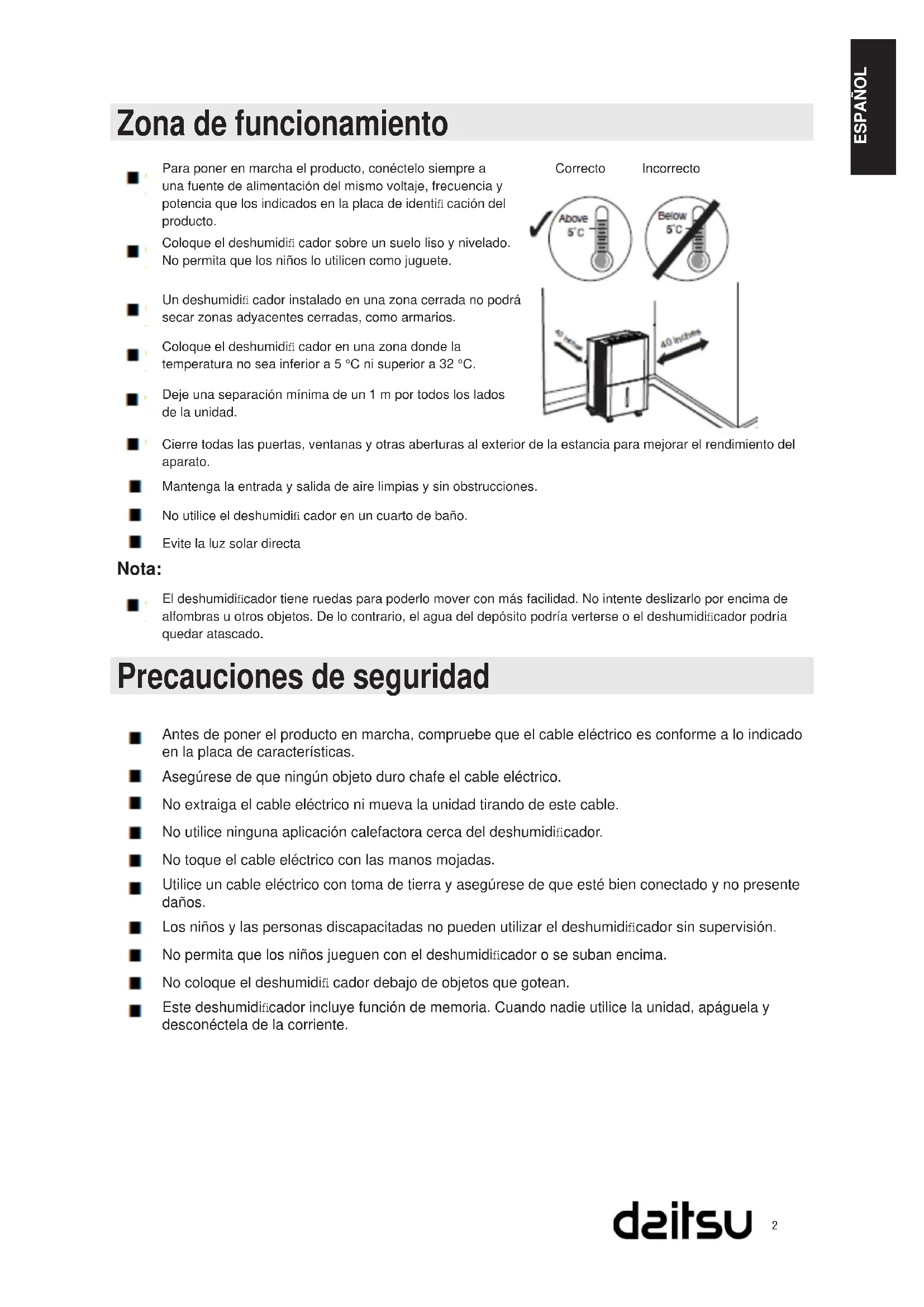 ÍNDICE Notas sobre el funcionamiento Zona de funcionamiento .......................................................................................................2 Precauciones de seguridad .................................................................................................... Nombres de las piezas .........................................................................................................4 Instrucciones de funcionamiento Método operativo ..................................................................................................................5 Opciones de drenaje ............................................................................................................8 Mantenimiento Limpieza y mantenimiento .................................................................................................. 9 Avería Resolución de problemas ...................................................................................................10 Almacenamiento a largo plazo ........................................................................................... 11 Esquema del diagrama eléctrico ........................................................................................ 11 Especifi caciones técnicas.................................................................................................. 12 (Los gráfi cos de este manual se incluyen solo a modo de referencia. Para obtener detalles específi cos, vea los productos reales).2 ESPAÑOL Zona de funcionamiento Para poner en marcha el producto, conéctelo siempre a una fuente de alimentación del mismo voltaje, frecuencia y potencia que los indicados en la placa de identifi cación del producto. Correcto Incorrecto Coloque el deshumidifi cador sobre un suelo liso y nivelado. No permita que los niños lo utilicen como juguete. Un deshumidifi cador instalado en una zona cerrada no podrá secar zonas adyacentes cerradas, como armarios. Coloque el deshumidifi cador en una zona donde la temperatura no sea inferior a 5 °C ni superior a 32 °C. Deje una separación mínima de un 1 m por todos los lados de la unidad. Cierre todas las puertas, ventanas y otras aberturas al exterior de la estancia para mejorar el rendimiento del aparato. Mantenga la entrada y salida de aire limpias y sin obstrucciones. No utilice el deshumidifi cador en un cuarto de baño. Evite la luz solar directa Nota: El deshumidifi cador tiene ruedas para poderlo mover con más facilidad. No intente deslizarlo por encima de alfombras u otros objetos. De lo contrario, el agua del depósito podría verterse o el deshumidifi cador podría quedar atascado. Precauciones de seguridad Antes de poner el producto en marcha, compruebe que el cable eléctrico es conforme a lo indicado en la placa de características. Asegúrese de que ningún objeto duro chafe el cable eléctrico. No extraiga el cable eléctrico ni mueva la unidad tirando de este cable. No utilice ninguna aplicación calefactora cerca del deshumidifi cador. No toque el cable eléctrico con las manos mojadas. Utilice un cable eléctrico con toma de tierra y asegúrese de que esté bien conectado y no presente daños. Los niños y las personas discapacitadas no pueden utilizar el deshumidifi cador sin supervisión. No permita que los niños jueguen con el deshumidifi cador o se suban encima. No coloque el deshumidifi cador debajo de objetos que gotean. Este deshumidifi cador incluye función de memoria. Cuando nadie utilice la unidad, apáguela y desconéctela de la corriente.ESPAÑOL
