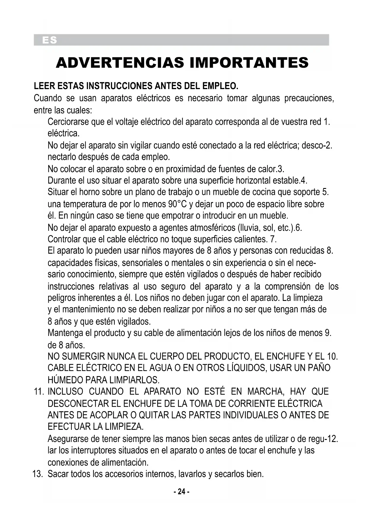 ADVERTENCIAS IMPORTANTES LEER ESTAS INSTRUCCIONES ANTES DEL EMPLEO. Cuando se usan aparatos eléctricos es necesario tomar algunas precauciones, entre las cuales: Cerciorarse que el voltaje eléctrico del aparato corresponda al de vuestra red 1. eléctrica. No dejar el aparato sin vigilar cuando esté conectado a la red eléctrica; desco-2. nectarlo después de cada empleo. No colocar el aparato sobre o en proximidad de fuentes de calor.3. Durante el uso situar el aparato sobre una superficie horizontal estable.4. Situar el horno sobre un plano de trabajo o un mueble de cocina que soporte 5. una temperatura de por lo menos 90°C y dejar un poco de espacio libre sobre él. En ningún caso se tiene que empotrar o introducir en un mueble. No dejar el aparato expuesto a agentes atmosféricos (lluvia, sol, etc.).6. Controlar que el cable eléctrico no toque superficies calientes. 7. El aparato lo pueden usar niños mayores de 8 años y personas con reducidas 8. capacidades físicas, sensoriales o mentales o sin experiencia o sin el nece- sario conocimiento, siempre que estén vigilados o después de haber recibido instrucciones relativas al uso seguro del aparato y a la comprensión de los peligros inherentes a él. Los niños no deben jugar con el aparato. La limpieza y el mantenimiento no se deben realizar por niños a no ser que tengan más de 8 años y que estén vigilados. Mantenga el producto y su cable de alimentación lejos de los niños de menos 9. de 8 años. NO SUMERGIR NUNCA EL CUERPO DEL PRODUCTO, EL ENCHUFE Y EL 10. CABLE ELÉCTRICO EN EL AGUA O EN OTROS LÍQUIDOS, USAR UN PAÑO HÚMEDO PARA LIMPIARLOS. INCLUSO CUANDO EL APARATO NO ESTÉ EN MARCHA, HAY QUE 11. DESCONECTAR EL ENCHUFE DE LA TOMA DE CORRIENTE ELÉCTRICA ANTES DE ACOPLAR O QUITAR LAS PARTES INDIVIDUALES O ANTES DE EFECTUAR LA LIMPIEZA. Asegurarse de tener siempre las manos bien secas antes de utilizar o de regu-12. lar los interruptores situados en el aparato o antes de tocar el enchufe y las conexiones de alimentación. Sacar todos los accesorios internos, lavarlos y secarlos bien.13.ES