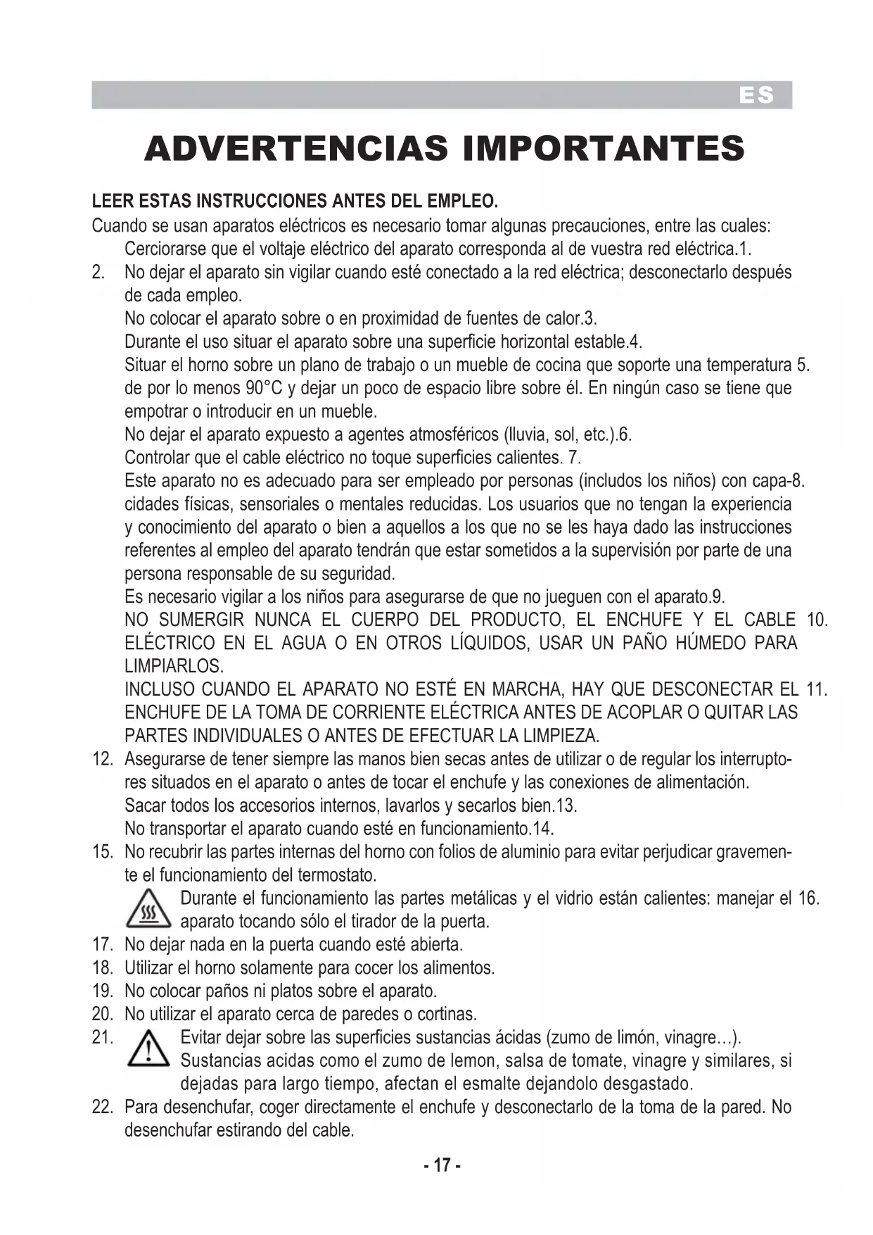 ADVERTENCIAS IMPORTANTES LEER ESTAS INSTRUCCIONES ANTES DEL EMPLEO. Cuando se usan aparatos eléctricos es necesario tomar algunas precauciones, entre las cuales: Cerciorarse que el voltaje eléctrico del aparato corresponda al de vuestra red eléctrica.1. No dejar el aparato sin vigilar cuando esté conectado a la red eléctrica; desconectarlo después 2. de cada empleo. No colocar el aparato sobre o en proximidad de fuentes de calor.3. Durante el uso situar el aparato sobre una superficie horizontal estable.4. Situar el horno sobre un plano de trabajo o un mueble de cocina que soporte una temperatura 5. de por lo menos 90°C y dejar un poco de espacio libre sobre él. En ningún caso se tiene que empotrar o introducir en un mueble. No dejar el aparato expuesto a agentes atmosféricos (lluvia, sol, etc.).6. Controlar que el cable eléctrico no toque superficies calientes. 7. Este aparato no es adecuado para ser empleado por personas (includos los niños) con capa-8. cidades físicas, sensoriales o mentales reducidas. Los usuarios que no tengan la experiencia y conocimiento del aparato o bien a aquellos a los que no se les haya dado las instrucciones referentes al empleo del aparato tendrán que estar sometidos a la supervisión por parte de una persona responsable de su seguridad. Es necesario vigilar a los niños para asegurarse de que no jueguen con el aparato.9. NO SUMERGIR NUNCA EL CUERPO DEL PRODUCTO, EL ENCHUFE Y EL CABLE 10. ELÉCTRICO EN EL AGUA O EN OTROS LÍQUIDOS, USAR UN PAÑO HÚMEDO PARA LIMPIARLOS. INCLUSO CUANDO EL APARATO NO ESTÉ EN MARCHA, HAY QUE DESCONECTAR EL 11. ENCHUFE DE LA TOMA DE CORRIENTE ELÉCTRICA ANTES DE ACOPLAR O QUITAR LAS PARTES INDIVIDUALES O ANTES DE EFECTUAR LA LIMPIEZA. Asegurarse de tener siempre las manos bien secas antes de utilizar o de regular los interrupto-12. res situados en el aparato o antes de tocar el enchufe y las conexiones de alimentación. Sacar todos los accesorios internos, lavarlos y secarlos bien.13. No transportar el aparato cuando esté en funcionamiento.14. No recubrir las partes internas del horno con folios de aluminio para evitar perjudicar gravemen-15. te el funcionamiento del termostato. Durante el funcionamiento las partes metálicas y el vidrio están calientes: manejar el 16. aparato tocando sólo el tirador de la puerta. No dejar nada en la puerta cuando esté abierta.17. Utilizar el horno solamente para cocer los alimentos.18. No colocar paños ni platos sobre el aparato.19. No utilizar el aparato cerca de paredes o cortinas.20. Evitar dejar sobre las superficies sustancias ácidas (zumo de limón, vinagre…).21. Sustancias acidas como el zumo de lemon, salsa de tomate, vinagre y similares, si dejadas para largo tiempo, afectan el esmalte dejandolo desgastado. Para desenchufar, coger directamente el enchufe y desconectarlo de la toma de la pared. No 22. desenchufar estirando del cable.ES