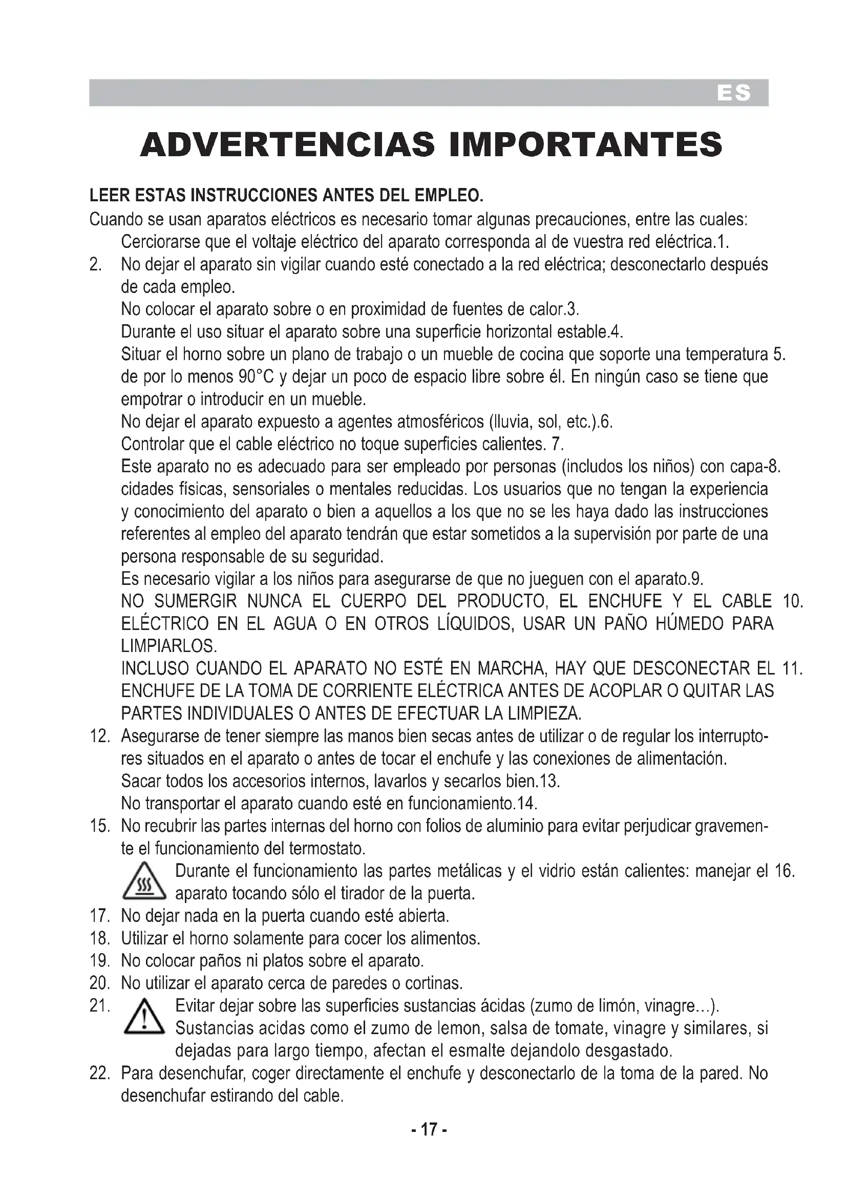 ADVERTENCIAS IMPORTANTES LEER ESTAS INSTRUCCIONES ANTES DEL EMPLEO. Cuando se usan aparatos eléctricos es necesario tomar algunas precauciones, entre las cuales: Cerciorarse que el voltaje eléctrico del aparato corresponda al de vuestra red eléctrica.1. No dejar el aparato sin vigilar cuando esté conectado a la red eléctrica; desconectarlo después 2. de cada empleo. No colocar el aparato sobre o en proximidad de fuentes de calor.3. Durante el uso situar el aparato sobre una superficie horizontal estable.4. Situar el horno sobre un plano de trabajo o un mueble de cocina que soporte una temperatura 5. de por lo menos 90°C y dejar un poco de espacio libre sobre él. En ningún caso se tiene que empotrar o introducir en un mueble. No dejar el aparato expuesto a agentes atmosféricos (lluvia, sol, etc.).6. Controlar que el cable eléctrico no toque superficies calientes. 7. Este aparato no es adecuado para ser empleado por personas (includos los niños) con capa-8. cidades físicas, sensoriales o mentales reducidas. Los usuarios que no tengan la experiencia y conocimiento del aparato o bien a aquellos a los que no se les haya dado las instrucciones referentes al empleo del aparato tendrán que estar sometidos a la supervisión por parte de una persona responsable de su seguridad. Es necesario vigilar a los niños para asegurarse de que no jueguen con el aparato.9. NO SUMERGIR NUNCA EL CUERPO DEL PRODUCTO, EL ENCHUFE Y EL CABLE 10. ELÉCTRICO EN EL AGUA O EN OTROS LÍQUIDOS, USAR UN PAÑO HÚMEDO PARA LIMPIARLOS. INCLUSO CUANDO EL APARATO NO ESTÉ EN MARCHA, HAY QUE DESCONECTAR EL 11. ENCHUFE DE LA TOMA DE CORRIENTE ELÉCTRICA ANTES DE ACOPLAR O QUITAR LAS PARTES INDIVIDUALES O ANTES DE EFECTUAR LA LIMPIEZA. Asegurarse de tener siempre las manos bien secas antes de utilizar o de regular los interrupto-12. res situados en el aparato o antes de tocar el enchufe y las conexiones de alimentación. Sacar todos los accesorios internos, lavarlos y secarlos bien.13. No transportar el aparato cuando esté en funcionamiento.14. No recubrir las partes internas del horno con folios de aluminio para evitar perjudicar gravemen-15. te el funcionamiento del termostato. Durante el funcionamiento las partes metálicas y el vidrio están calientes: manejar el 16. aparato tocando sólo el tirador de la puerta. No dejar nada en la puerta cuando esté abierta.17. Utilizar el horno solamente para cocer los alimentos.18. No colocar paños ni platos sobre el aparato.19. No utilizar el aparato cerca de paredes o cortinas.20. Evitar dejar sobre las superficies sustancias ácidas (zumo de limón, vinagre…).21. Sustancias acidas como el zumo de lemon, salsa de tomate, vinagre y similares, si dejadas para largo tiempo, afectan el esmalte dejandolo desgastado. Para desenchufar, coger directamente el enchufe y desconectarlo de la toma de la pared. No 22. desenchufar estirando del cable.ES