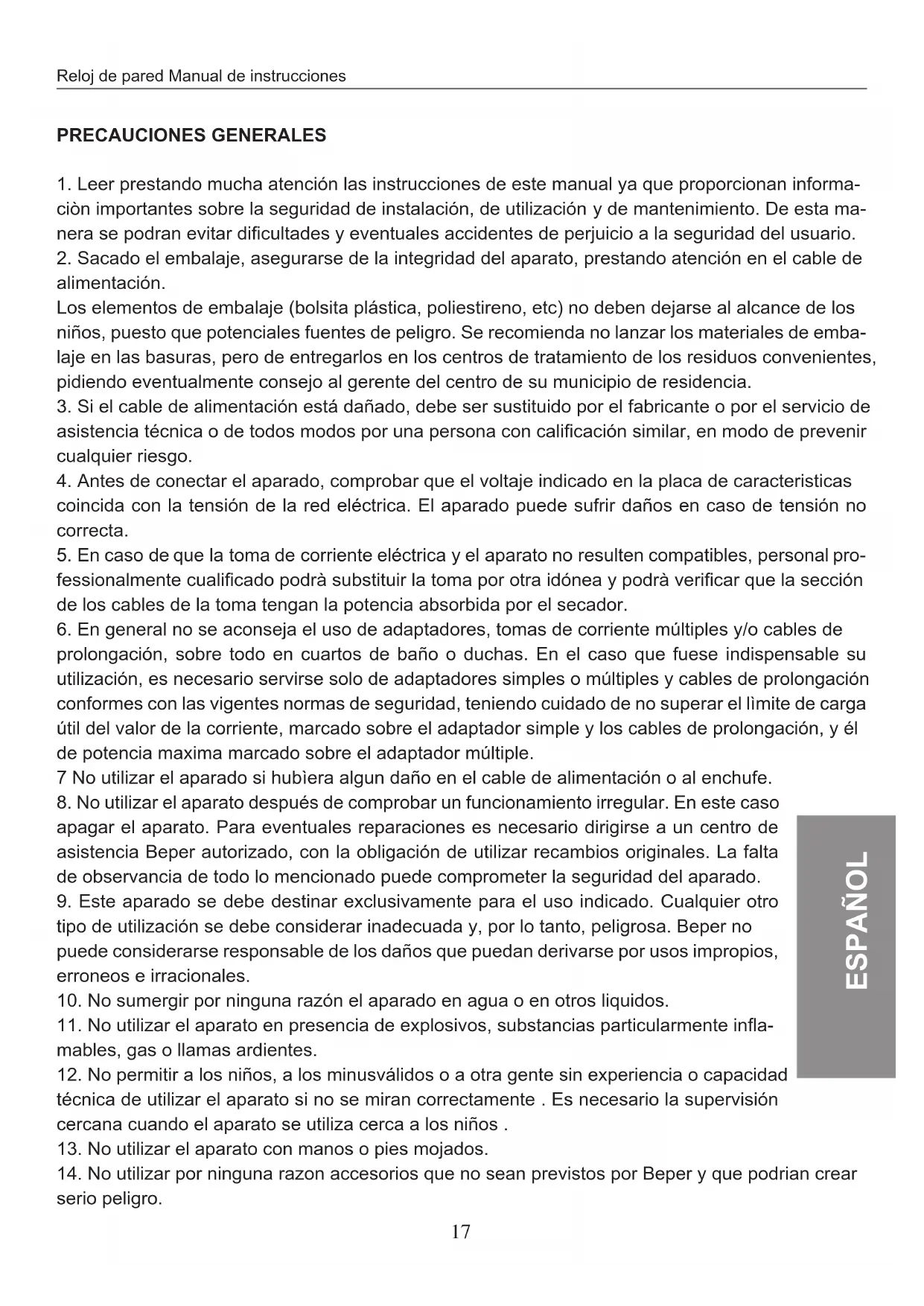 7 No utiliser el aparado si hubiera algo dano en el cable de alimentacion o al enchufe. - No utilizes el aparato antes de comprobar un funcionaatorio irregular. En este caso apagar el aparato. Para eventuales reparaciones esnecessary dirigirse a un centro de asistencia Beper autorizzato, con la obligacion de utilizing recambios originales. La falta de observancia de todo lo mentionadouede prometer la calidad del aparado.