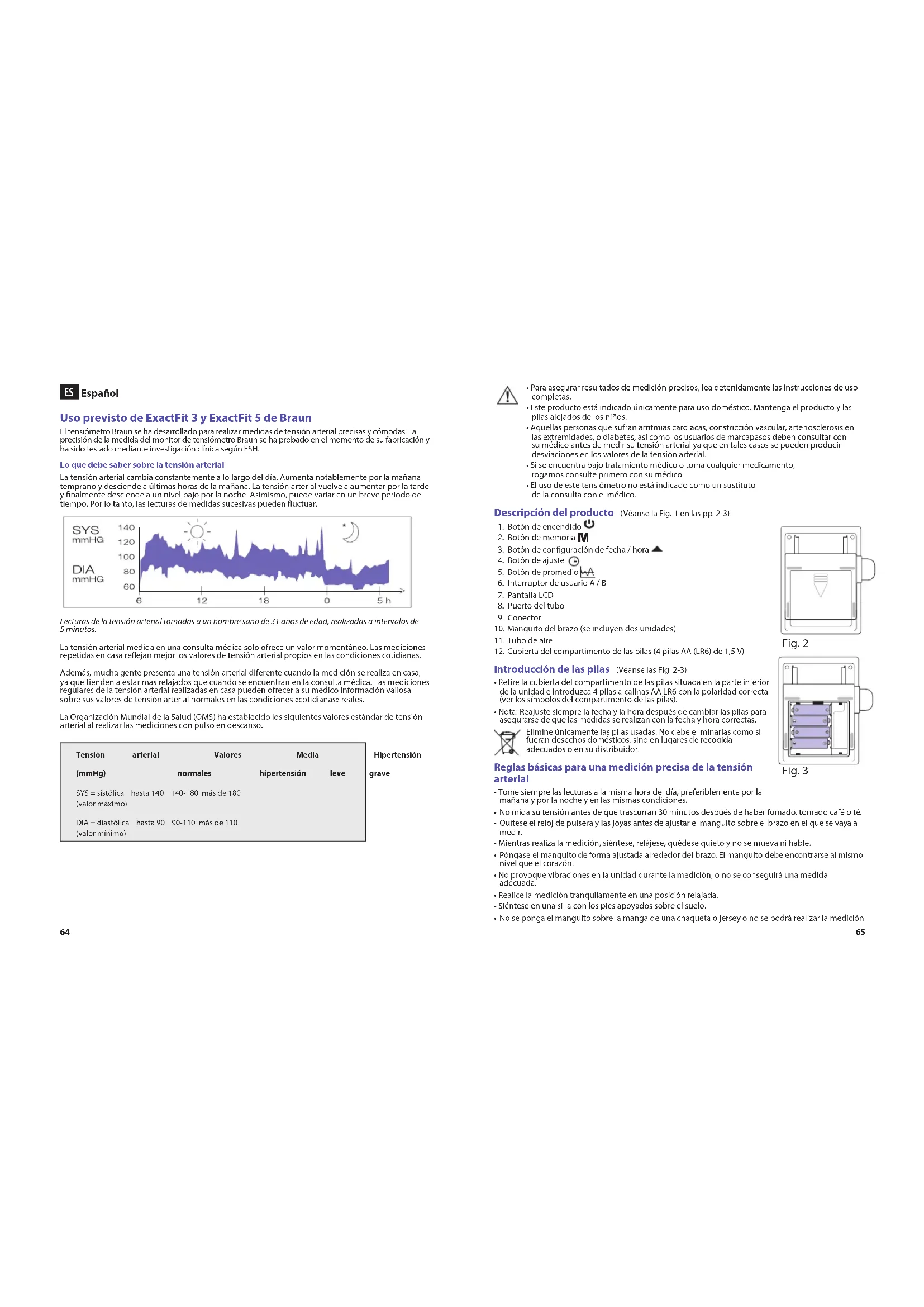 Español Uso previsto de ExactFit 3 y ExactFit 5 de Braun El tensiómetro Braun se ha desarrollado para realizar medidas de tensión arterial precisas y cómodas. La precisión de la medida del monitor de tensiómetro Braun se ha probado en el momento de su fabricación y ha sido testado mediante investigación clínica según ESH.Lo que debe saber sobre la tensión arterialLa tensión arterial cambia constantemente a lo largo del día. Aumenta notablemente por la mañana temprano y desciende a últimas horas de la mañana. La tensión arterial vuelve a aumentar por la tarde y nalmente desciende a un nivel bajo por la noche. Asimismo, puede variar en un breve periodo de tiempo. Por lo tanto, las lecturas de medidas sucesivas pueden uctuar.Lecturas de la tensión arterial tomadas a un hombre sano de 31 años de edad, realizadas a intervalos de 5 minutos. La tensión arterial medida en una consulta médica solo ofrece un valor momentáneo. Las mediciones repetidas en casa reejan mejor los valores de tensión arterial propios en las condiciones cotidianas.Además, mucha gente presenta una tensión arterial diferente cuando la medición se realiza en casa, ya que tienden a estar más relajados que cuando se encuentran en la consulta médica. Las mediciones regulares de la tensión arterial realizadas en casa pueden ofrecer a su médico información valiosa sobre sus valores de tensión arterial normales en las condiciones «cotidianas» reales.La Organización Mundial de la Salud (OMS) ha establecido los siguientes valores estándar de tensión arterial al realizar las mediciones con pulso en descanso.Tensión arterial Valores Media Hipertensión (mmHg) normales hipertensión leve graveSYS = sistólica hasta 140 140-180 más de 180 (valor máximo)DIA = diastólica hasta 90 90-110 más de 110(valor mínimo)• Para asegurar resultados de medición precisos, lea detenidamente las instrucciones de uso completas. • Este producto está indicado únicamente para uso doméstico. Mantenga el producto y las pilas alejados de los niños. • Aquellas personas que sufran arritmias cardiacas, constricción vascular, arteriosclerosis en las extremidades, o diabetes, así como los usuarios de marcapasos deben consultar con su médico antes de medir su tensión arterial ya que en tales casos se pueden producir desviaciones en los valores de la tensión arterial. • Si se encuentra bajo tratamiento médico o toma cualquier medicamento, rogamos consulte primero con su médico. • El uso de este tensiómetro no está indicado como un sustituto de la consulta con el médico. Descripción del producto (Véanse la Fig. 1 en las pp. 2-3)