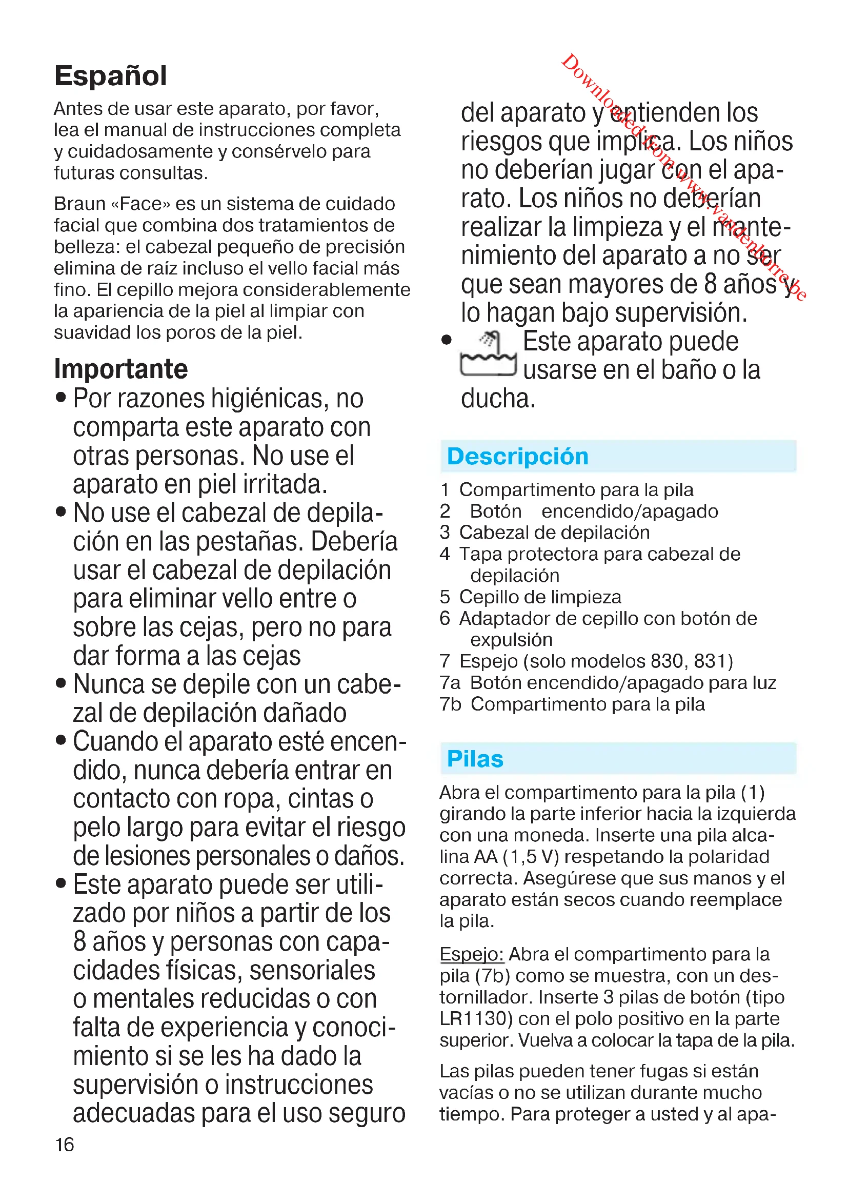- Para obtener un resultado óptimo, cambie el cepillo (5) cada 3 meses o antes si los filamentos se deforman debido al uso frecuente. Los recam- bios de Cepillo (ref. no. 89 facial Spa) están disponibles en su tienda, los Centros de Servicio Braun o vía www. braun.com. Información medioambiental El producto contiene baterías y/o residuos eléctricos reciclables. Para proteger del medio ambiente no tire el aparato en la basura doméstica, llévelo, para su reciclaje, a los puntos de recogida de residuos eléctricos previstos en su país. Sujeto a modificaciones sin previo aviso. Garantía Braun concede a este producto 2 años de garantía a partir de la fecha de compra. Dentro del periodo de garantía, subsana- remos, sin cargo alguno, cualquier defecto del aparato imputable tanto a los materiales como a la fabricación, ya sea reparando, sustituyendo piezas, o facili- tando un aparato nuevo según nuestro criterio. La garantía no ampara averías por uso indebido, funcionamiento a distinto vol- taje del indicado, conexión a un enchufe inadecuado, rotura, desgaste normal por el uso que causen defectos o una dismi- nución en el valor o funcionamiento del producto. La garantía perderá su efecto en caso de ser efectuadas reparaciones por per- sonas no autorizadas, o si no son utiliza- dos recambios originales de Braun. La garantía solamente tendrá validez si la fecha de compra es confirmada mediante la factura o el albarán de compra corres- pondiente. Esta garantía tiene validez en todos los países donde este producto sea dis- tribuido por Braun o por un distribuidor asignado por Braun. En caso de reclamación bajo esta garan- tía, diríjase al Servicio de Asistencia Técnica de Braun más cercano: www. service.braun.com. Solo para España Servicio al consumidor: Para localizar a su Servicio Braun más cercano o en el caso de que tenga Vd. alguna duda referente al funcionamiento de este producto, le rogamos contacte con el teléfono de este servicio 901 11 61 84. 96892473_SE810_S4-110.indd 1896892473_SE810_S4-110.indd 18 27.02.14 15:3327.02.14 15:33 CSS APPROVED Effective Date 5Mar2014 GMT - Printed 02Oct2014 Page 18 of 110 Downloaded from www.vandenborre.be19 Português Antes de utilizar este aparelho pela pri- meira vez, leia atenta e cuidadosamente as instruções de utilização e guarde-as para consulta futura. Braun «Face» é um sistema de cuidados faciais que combina dois tratamentos de beleza: A pequena e precisa cabeça de depilação remove mesmo os mais finos pêlos faciais a partir da raíz. A escova de limpeza facial melhora a aparência da sua pele através de uma limpeza suave e profunda dos poros. Importante