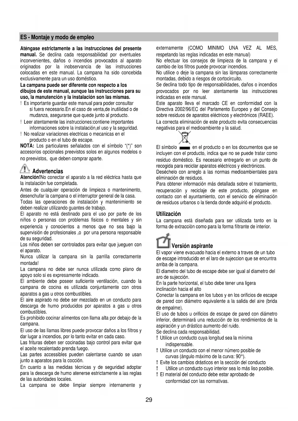 Se l'illuminazione non dovesse funzionare, controllate il corretto inserimento delle lampade nella sede prima di chiamare l'assistenza tecnica.29 ES - Montaje y modo de empleo Aténgase estrictamente a las instrucciones del presente manual. Se declina cada responsabilidad por eventuales inconvenientes, daños o incendios provocados al aparato originados por la inobservancia de las instrucciones colocadas en este manual. La campana ha sido concebida exclusivamente para un uso doméstico. La campana puede ser diferente con respecto a los dibujos de este manual, aunque las instrucciones para su uso, la manutención y la instalación son las mismas. ! Es importante guardar este manual para poder consultar si fuera necesario.En el caso de venta,de inutilidad o de mudanza, asegurarse que quede junto al producto. ! Leer atentamente las instrucciones:contiene importantes informaciones sobre la instalación,el uso y la seguridad. ! No realizar variaciones electricas o mecanicas en el producto o en el tubo de escape. NOTA: Los particulares señalados con el símbolo “(*)” son accesorios opcionales preevistos solos en algunos modelos o no preevistos, que deben comprar aparte. Advertencias Atención!No conectar el aparato a la red eléctrica hasta que la instalación fue completada. Antes de cualquier operación de limpieza o mantenimento, desenchufar la campana o el interruptor general de la casa. Todas las operaciones de instalación y mantenimiento se deben realizar utilizando guantes de trabajo. El aparato no está destinado para el uso por parte de los niños o personas con problemas fisicos o mentales y sin experiencia y conocientos a menos que no sea bajo la supervisión de profesionales ,o por una persona responsable de su seguridad. Los niños deben ser controlados para evitar que jueguen con el aparato. Nunca utilizar la campana sin la parrilla correctamente montada! La campana no debe ser nunca utilizada como plano de apoyo solo si es expresamente indicado. El ambiente debe poseer suficiente ventilación, cuando la campana de cocina es utilizada conjuntamente con otros aparatos a gas u otros combustibles. El aire aspirado no debe ser mezclado en un conducto para descarga de humo producidos por aparatos a gas u otros combustibles. Es prohibido cocinar alimentos con llama alta por debajo de la campana. El uso de las llamas libres puede provocar daños a los filtros y dar lugar a incendios, por lo tanto evitar en cada caso. Las frituras deben ser cocinadas bajo control para evitar que el aceite recalentado prenda fuego. Las partes accessibles pueden calentarse cuando se usan junto a aparatos para la cocción. En cuanto a las medidas técnicas y de seguridad adoptar para la descarga de humo atenerse estrictamente a las reglas de las autoridades locales. La campana se debe limpiar siempre internamente y externamente (COMO MINIMO UNA VEZ AL MES, respetando las reglas indicadas en este manual) No efectuar los consejos de limpieza de la campana y el cambio de los filtros puede provocar incendios. No utilice o deje la campana sin las lámparas correctamente montadas, debido a riesgos de cortocircuito. Se declina todo tipo de responsabilidades, daños o incendios provocados por no leer atentamente las instrucciones indicadas en este manual. Este aparato lleva el marcado CE en conformidad con la Directiva 2002/96/EC del Parlamento Europeo y del Consejo sobre residuos de aparatos eléctricos y electrónicos (RAEE). La correcta eliminación de este producto evita consecuencias negativas para el medioambiente y la salud. El símbolo en el producto o en los documentos que se incluyen con el producto, indica que no se puede tratar como residuo doméstico. Es necesario entregarlo en un punto de recogida para reciclar aparatos eléctricos y electrónicos. Deséchelo con arreglo a las normas medioambientales para eliminación de residuos. Para obtener información más detallada sobre el tratamiento, recuperación y reciclaje de este producto, póngase en contacto con el ayuntamiento, con el servicio de eliminación de residuos urbanos o la tienda donde adquirió el producto. Utilización La campana està diseñada para ser utilizada tanto en la forma de extracciòn como para la forma filtrante de interior. Versión aspirante El vapor viene evacuado hacia el externo a traves de un tubo de escape introducido en el laro de sujeccion que se encuntra arriba de la campana. El diametro del tubo de escape debe ser igual al diametro del aro de sujección. En la parte horizontal, el tubo debe tener una ligera inclinación hacia el alto Conectar la campana en los tubos y en los orificios de escape de pared con diámetro equivalente a la salida del aire (brida de empalme). El uso de tubos u orificios de escape de pared con diámetro inferior, determinará una reducción de los rendimientos de la aspiración y un drástico aumento del ruido. Se declina cada responsabilidad. ! Utilice un conducto cuya longitud sea la mínima indispensable. ! Utilice un conducto con el menor número posible de curvas (ángulo máximo de la curva: 90°). ! Evite los cambios drásticos en la sección del conducto ! Utilice un conducto cuyo interior sea lo más liso posible. ! El material del conducto debe estar aprobado de conformidad con las normativas.30 Versión filtrante Se debe utilizar un filtro de carbón activo, disponible del vuestro proveedor.El aire aspirado viene reciclado antes de expulsarlo en el ambiente a través de la parrilla superior. Los modelos sin motor de aspiración solamente funcionan en versión aspirante y tienen que conectarse a una unidad periférica de aspiración (no suministrada). Las instrucciones de conexión se proveen con la unidad periférica de aspiración. Instalación La distancia mínima entre la superficie de cocción y la parte más baja de la campana no debe ser inferior a 50cm en el caso de cocinas electricas y de 65cm en el caso de cocinas a gas o mixtas. Si las instrucciones para la instal