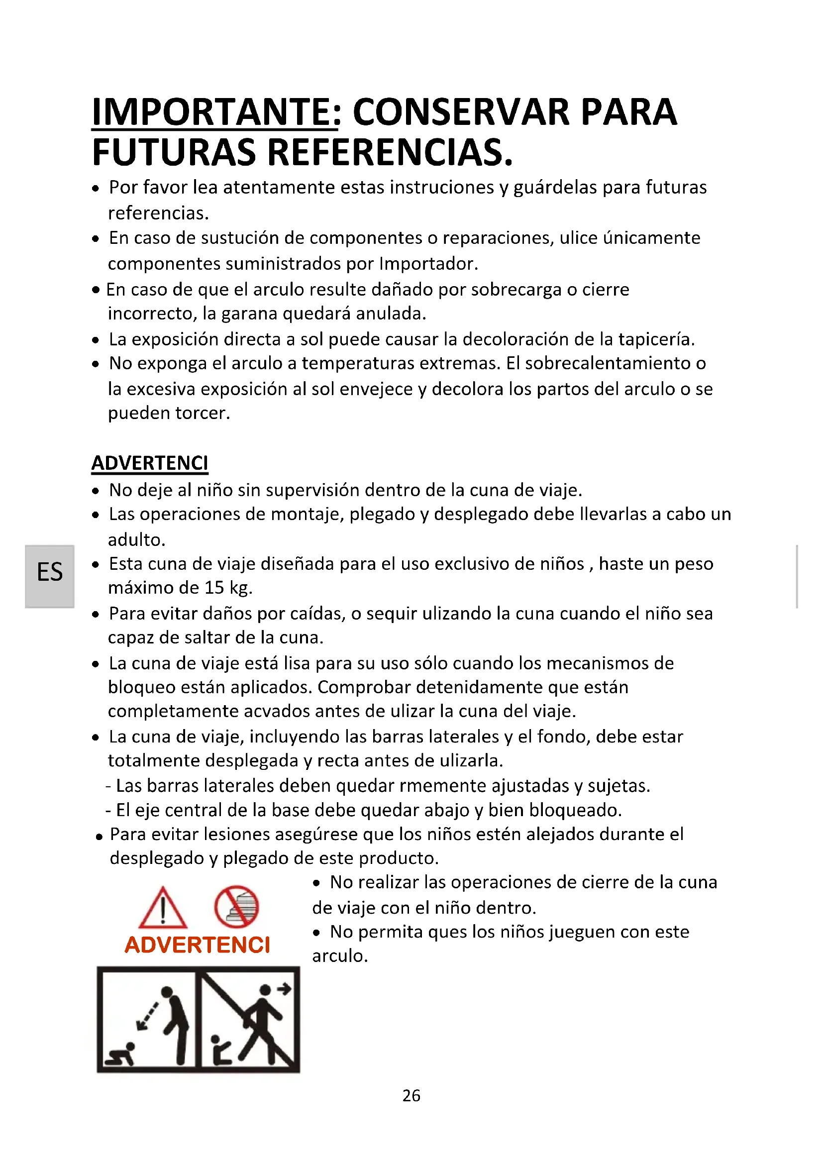 -Esta cuna de viaje diseñada para el uso exclusivo de niños, hacer un peso máximo de 15kg - Paraatar daños por caías, osequirulizingla cuna cuando el Niño sea capaz de saltar de la cuna.