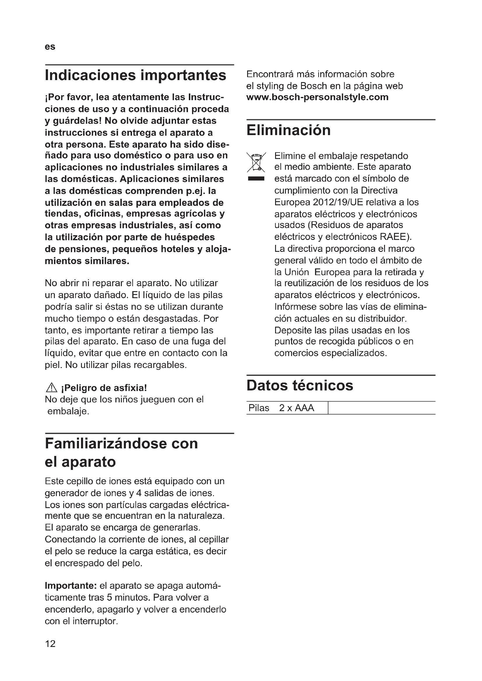 Elimine el embalaje respetando el medio ambiente. Este aparato está marcado con el símbolo de cumplimiento con la Directiva Europea 2012/19/UE relativa a los aparatos eléctricos y electrónicos usados (Residuos de aparatos eléctricos y electrónicos RAEE). La directiva proporciona el marco general válido en todo el ámbito de la Unión Europea para la retirada y la reutilización de los residuos de los aparatos eléctricos y electrónicos. Infórmese sobre las vías de elimina ción actuales en su distribuidor. Deposite las pilas usadas en los puntos de recogida públicos o en comercios especializados. Datos técnicos Pilas 2 x AAA13