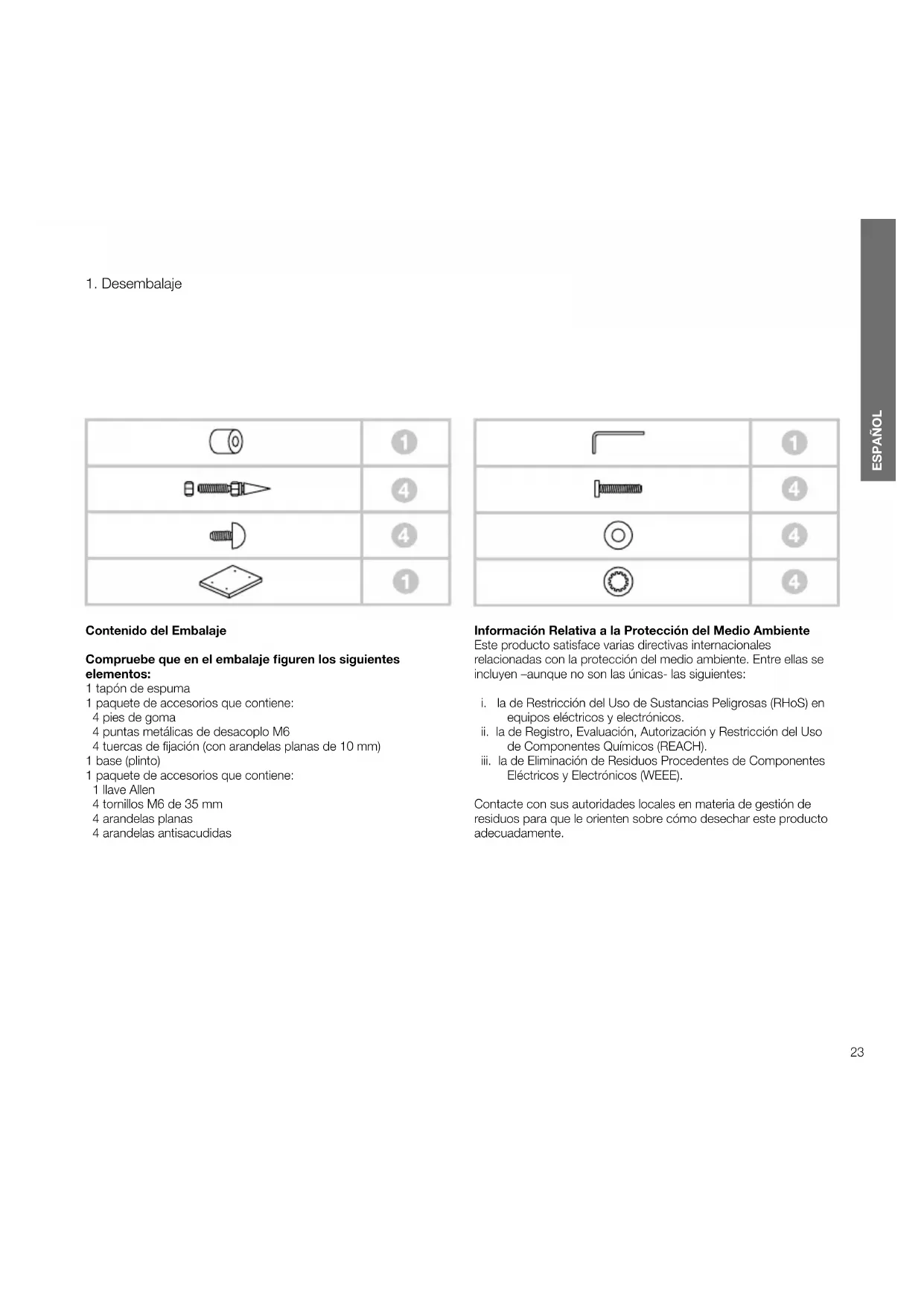 Contenido del Embalaje Compruebe que en el embalaje guren los siguientes elementos: 1 tapón de espuma 1 paquete de accesorios que contiene: 4 pies de goma 4 puntas metálicas de desacoplo M6 4 tuercas de jación (con arandelas planas de 10 mm) 1 base (plinto) 1 paquete de accesorios que contiene: 1 llave Allen 4 tornillos M6 de 35 mm 4 arandelas planas 4 arandelas antisacudidas Información Relativa a la Protección del Medio Ambiente Este producto satisface varias directivas internacionales relacionadas con la protección del medio ambiente. Entre ellas se incluyen –aunque no son las únicas- las siguientes: