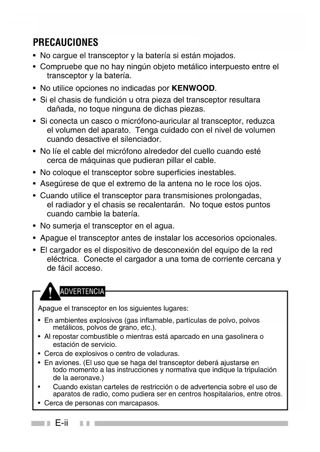 ◆ La ley gubernamental prohíbe la operación de radiotransmisores no autorizados dentro de los territorios que se encuentren bajo el control del gobierno. ◆ La operación ilegal se castigará con multa y/o encarcelamiento. ◆ Solicite la reparación solamente a un técnico cualificado. Seguridad: Es importante que el operador conozca y entienda los peligros comunes derivados del uso de cualquier transceptor.E-i