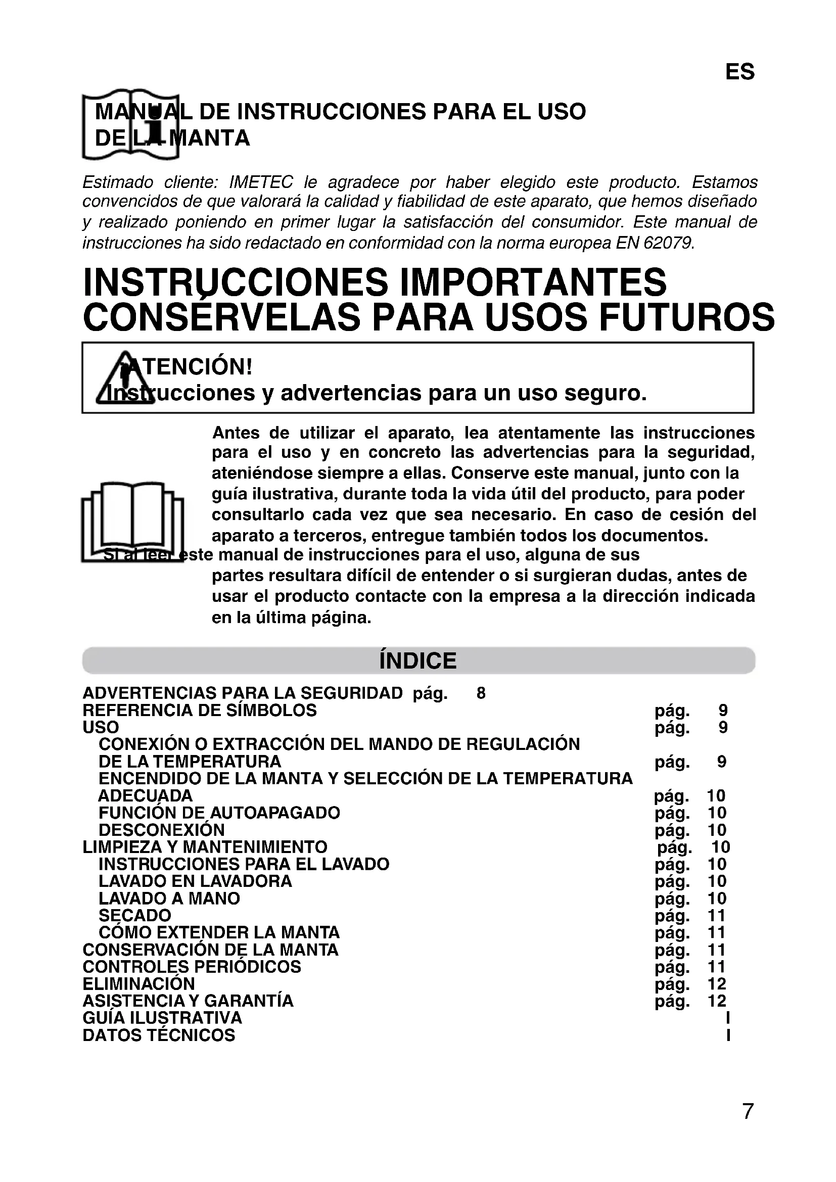 ¡ATENCIÓN! Instrucciones y advertencias para un uso seguro. Antes de utilizar el aparato, lea atentamente las instrucciones para el uso y en concreto las advertencias para la seguridad, ateniéndose siempre a ellas. Conserve este manual, junto con la guía ilustrativa, durante toda la vida útil del producto, para poder consultarlo cada vez que sea necesario. En caso de cesión del aparato a terceros, entregue también todos los documentos. Si al leer este manual de instrucciones para el uso, alguna de sus partes resultara difícil de entender o si surgieran dudas, antes de usar el producto contacte con la empresa a la dirección indicada en la última página. ÍNDICE ADVERTENCIAS PARA LA SEGURIDAD pág. 8 REFERENCIA DE SÍMBOLOS pág. 9 USO pág. 9 CONEXIÓN O EXTRACCIÓN DEL MANDO DE REGULACIÓN DE LA TEMPERATURA pág. 9 ENCENDIDO DE LA MANTA Y SELECCIÓN DE LA TEMPERATURA ADECUADA pág. 10 FUNCIÓN DE AUTOAPAGADO pág. 10 DESCONEXIÓN pág. 10 LIMPIEZA Y MANTENIMIENTO pág. 10 INSTRUCCIONES PARA EL LAVADO pág. 10 LAVADO EN LAVADORA pág. 10 LAVADO A MANO pág. 10 SECADO pág. 11 CÓMO EXTENDER LA MANTA pág. 11 CONSERVACIÓN DE LA MANTA pág. 11 CONTROLES PERIÓDICOS pág. 11 ELIMINACIÓN pág. 12 ASISTENCIA Y GARANTÍA pág. 12