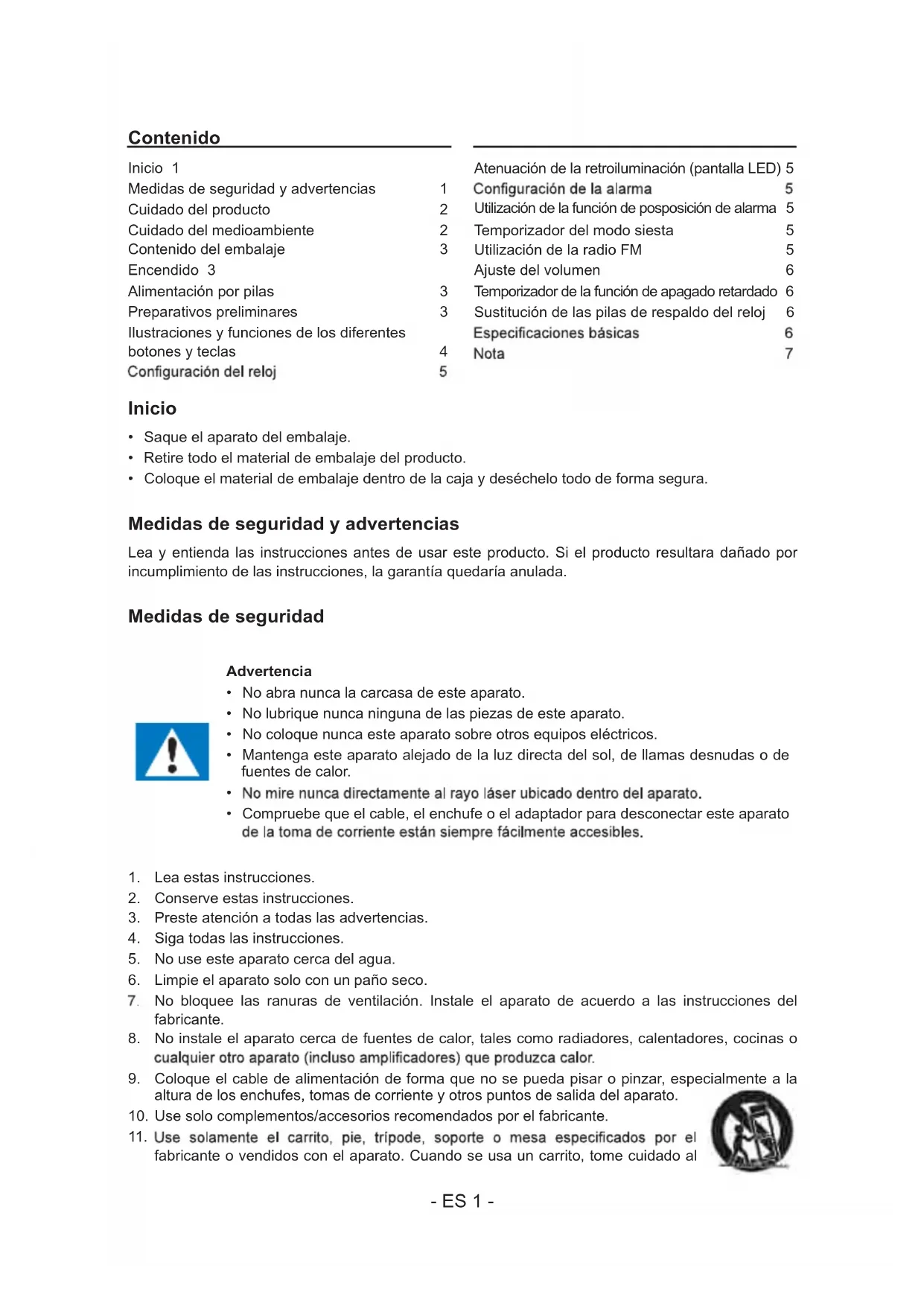 - Para apagar la funciona de radio de la alarma, pulse el botón [1] a fin de volver aponer el aparato en modo de esper.