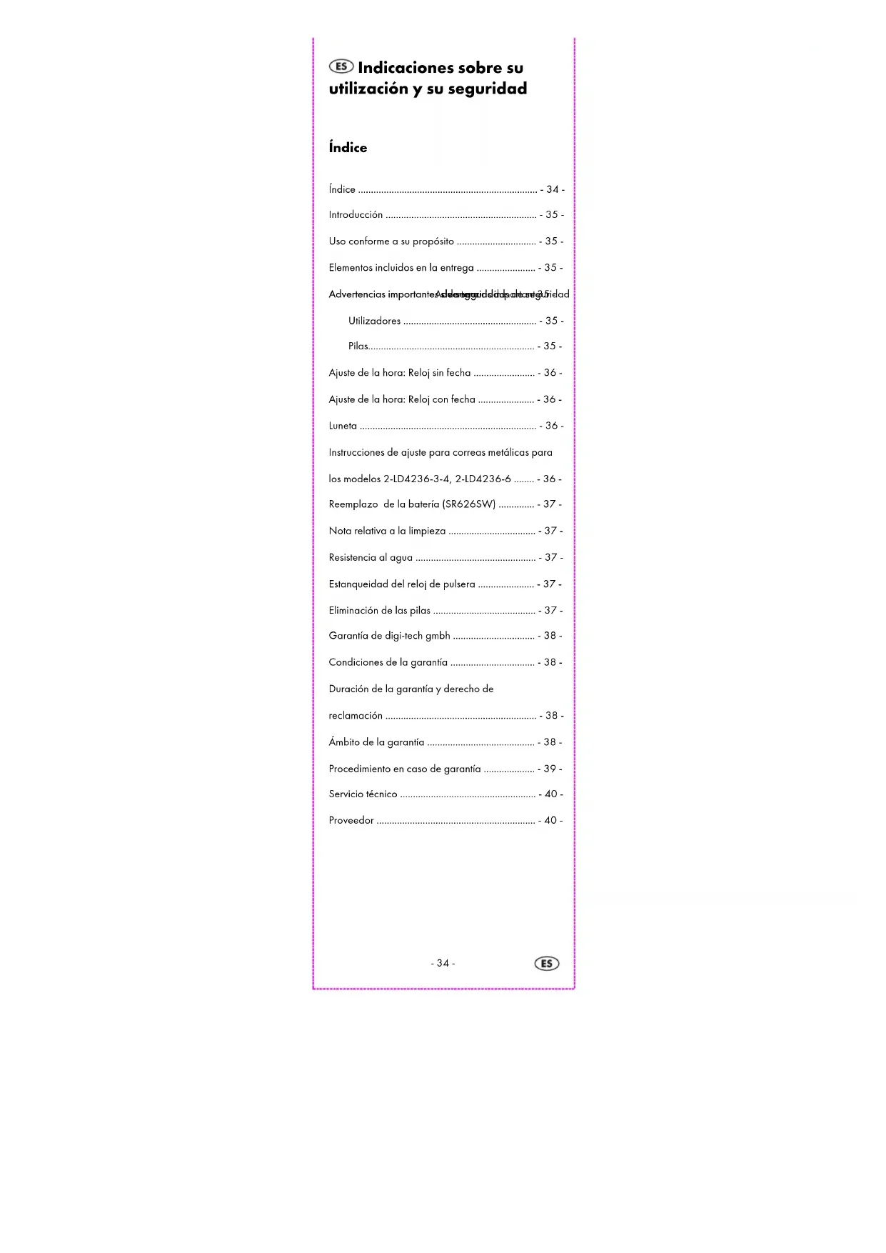 Índice ...................................................................... - 34 - Introducción ........................................................... - 35 - Uso conforme a su propósito ............................... - 35 - Elementos incluidos en la entrega ....................... - 35 - Advertencias importante Advertencias importanteAdvertencias importante Advertencias importantes de seguridad s de seguridads de seguridad s de seguridad ........ - 35 - Utilizadores .................................................... - 35 - Pilas................................................................. - 35 - Ajuste de la hora: Reloj sin fecha ........................ - 36 - Ajuste de la hora: Reloj con fecha ...................... - 36 - Luneta ..................................................................... - 36 - Instrucciones de ajuste para correas metálicas para los modelos 2-LD4236-3-4, 2-LD4236-6 ........ - 36 - Reemplazo de la batería (SR626SW) .............. - 37 - Nota relativa a la limpieza .................................. - 37 - Resistencia al agua ............................................... - 37 - Estanqueidad del reloj de pulsera ...................... - 37 - Eliminación de las pilas ........................................ - 37 - Garantía de digi-tech gmbh ................................ - 38 - Condiciones de la garantía ................................. - 38 - Duración de la garantía y derecho de reclamación ........................................................... - 38 - Ámbito de la garantía .......................................... - 38 - Procedimiento en caso de garantía .................... - 39 - Servicio técnico ..................................................... - 40 - Proveedor .............................................................. - 40 --