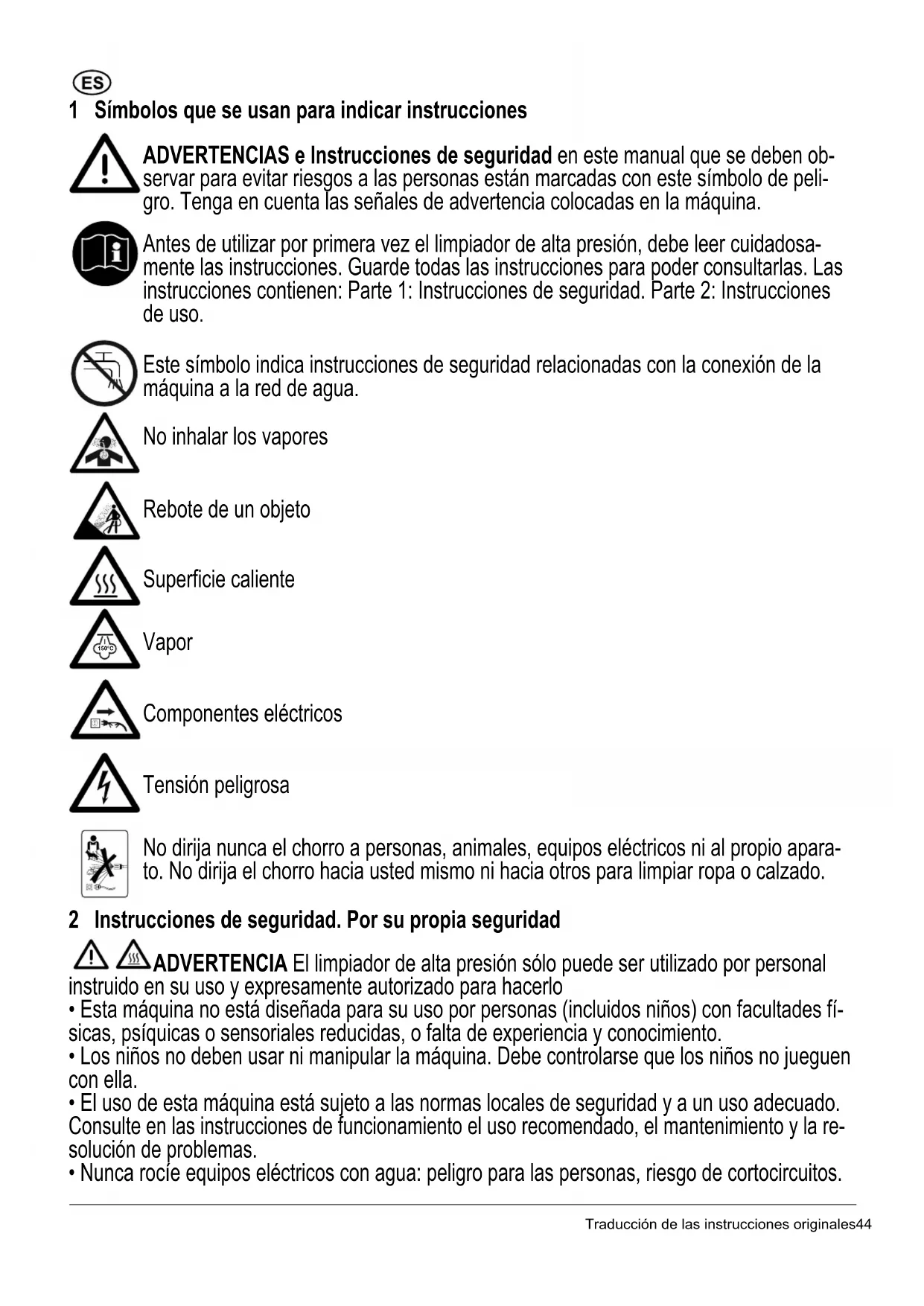 - Jos virtajohto on vahingoittunut, se on vaaran välttämiseksi vaihdatettava valmistajalla, val- mistajan valtuuttamassa huoltokorjaamossa tai valtuutetulla ammattilaisella.Traducción de las instrucciones originales44 1 Símbolos que se usan para indicar instrucciones ADVERTENCIAS e Instrucciones de seguridad en este manual que se deben ob- servar para evitar riesgos a las personas están marcadas con este símbolo de peli- gro. Tenga en cuenta las señales de advertencia colocadas en la máquina. Antes de utilizar por primera vez el limpiador de alta presión, debe leer cuidadosa- mente las instrucciones. Guarde todas las instrucciones para poder consultarlas. Las instrucciones contienen: Parte 1: Instrucciones de seguridad. Parte 2: Instrucciones de uso. Este símbolo indica instrucciones de seguridad relacionadas con la conexión de la máquina a la red de agua. No inhalar los vapores Rebote de un objeto Superficie caliente Vapor Componentes eléctricos Tensión peligrosa No dirija nunca el chorro a personas, animales, equipos eléctricos ni al propio apara- to. No dirija el chorro hacia usted mismo ni hacia otros para limpiar ropa o calzado. 2 Instrucciones de seguridad. Por su propia seguridad ADVERTENCIA El limpiador de alta presión sólo puede ser utilizado por personal instruido en su uso y expresamente autorizado para hacerlo
