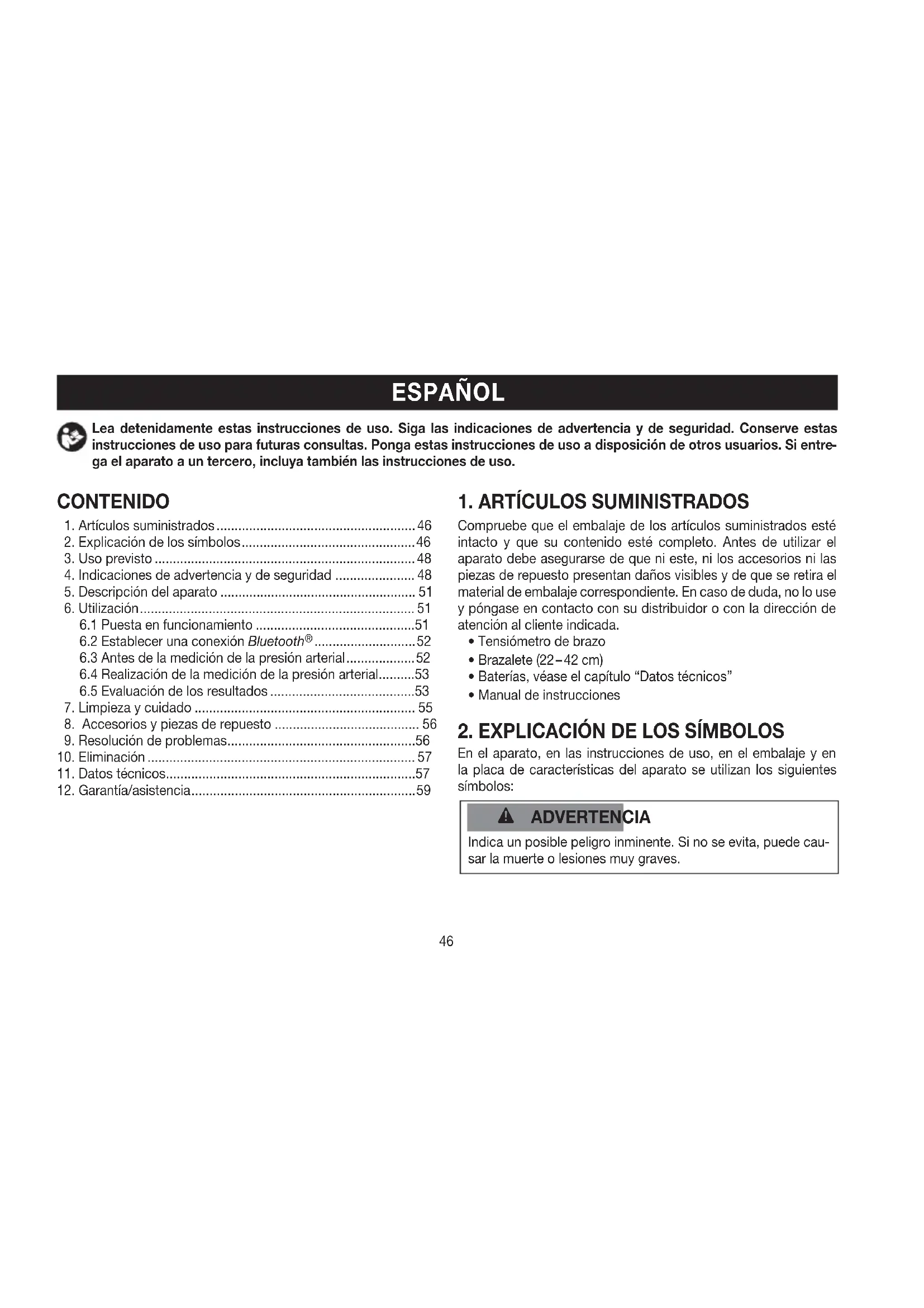 Finalidad El tensiómetro (en adelante dispositivo) se ha diseñado para la medición automática no invasiva de valores de presión arterial y pulso en el brazo. Está concebido para la medición automática por parte de adultos en el entorno doméstico. Grupo objetivo La medición de la presión arterial es adecuada para usuarios adultos cuyo perímetro de brazo se encuentre dentro del intervalo impreso en el brazalete. Beneficios clínicos El usuario puede registrar sus valores de presión arterial y pulso de forma rápida y sencilla con el aparato. Los valores medidos se clasifican según directrices internacionales en vigor y se evalúan gráficamente. El aparato también puede detectar cualquier latido irregular que pueda producirse durante la medición y avisar al usuario mediante un símbolo en la pantalla. Indicaciones El usuario puede monitorizar de forma autónoma la presión ar- terial y los valores del pulso en entornos domésticos en caso de hipertensión e hipotensión. No obstante, el usuario no precisa padecer hipertensión ni arritmias para utilizar el aparato. Contraindicaciones ADVERTENCIA