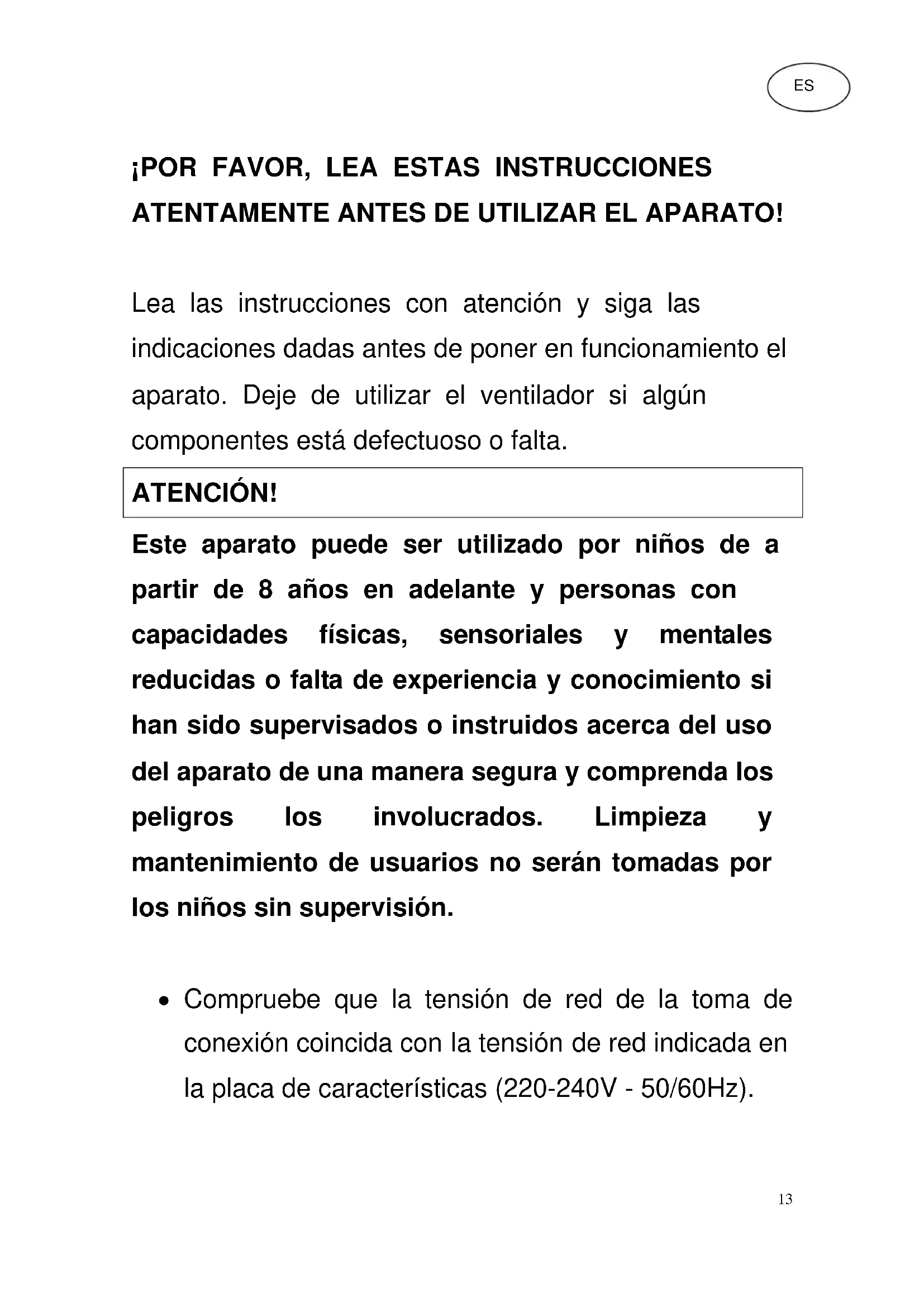 ATENTAMENTE ANTES DE UTILIZAR EL APARATO! Lea las instrucciones con atención y siga las indicaciones dadas antes de poner en funcionamiento el aparato. Deje de utilizar el ventilador si algún componentes está defectuoso o falta. ATENCIÓN! Este aparato puede ser utilizado por niños de a partir de 8 años en adelante y personas con capacidades físicas, sensoriales y mentales reducidas o falta de experiencia y conocimiento si han sido supervisados o instruidos acerca del uso del aparato de una manera segura y comprenda los peligros los involucrados. Limpieza y mantenimiento de usuarios no serán tomadas por los niños sin supervisión. Compruebe que la tensión de red de la toma de conexión coincida con la tensión de red indicada en la placa de características (220-240V - 50/60Hz). ES14 El cable de corriente no debe cubrirse. Conecte el aparato en un lugar donde nadie pueda tropezar con el cable de corriente. Asegúrese de que el ventilador descanse sobre una superficie firme y estable cuando esté en funcionamientopara evitar que pueda volcarse. Desenchufe la clavija de la toma de corriente cuando no utilice el aparato. Al hacerlo, no tire del cable, sino de la clavija. Asegúrese de que no hay objetos cerca del ventilador que puedan evitar su oscilación. No introduzca nunca los dedos, lápices o cualquier otro objeto a través de la rejilla con el ventilador en funcionamiento. Asegúrese de que no acercar el ventilador a cortinas, visillos, manteles, prendas de ropa ni el pelo y similares. Podrían aspirarse por la abertura en ventilador, lo que podría causar daños o lesiones personales. No use ningún aparato que tenga un cable o enchufe dañado, no funcione correctamente o se haya caído o dañado de cualquier otra forma.15 Antes de cada uso, compruebe que el cable no tenga quemaduras y/o zonas raídas. En caso afirmativo, el aparato debería ser revisado y el cable de alimentación sustituido. El aparato solo es adecuado para ponerse en servicio en interiores. El aparato, la clavija y el cable no deben entrar en contacto con agua ni con vapor de agua ni rociarse con fluidos. Nunca ponga el aparato en servicio cerca de una bañera, una ducha ni una piscina ni en un salón de lavado. Evite exponer el aparato a la luz solar directa y ponerlo en funcionamiento al lado de una ventana. No ponga el aparato en servicio con otro regulador del régimen de giro semiconductor (por ejemplo: dimmer). Durante el funcionamiento, el ventilador debe estar vertical y nunca recostado sobre un lateral. No use el ventilador en presencia de humos explosivos y/o inflamables. Desconecte el ventilador antes de limpiarlo. Si es necesaria una reparación, póngase en16 contacto con su distribuidor.