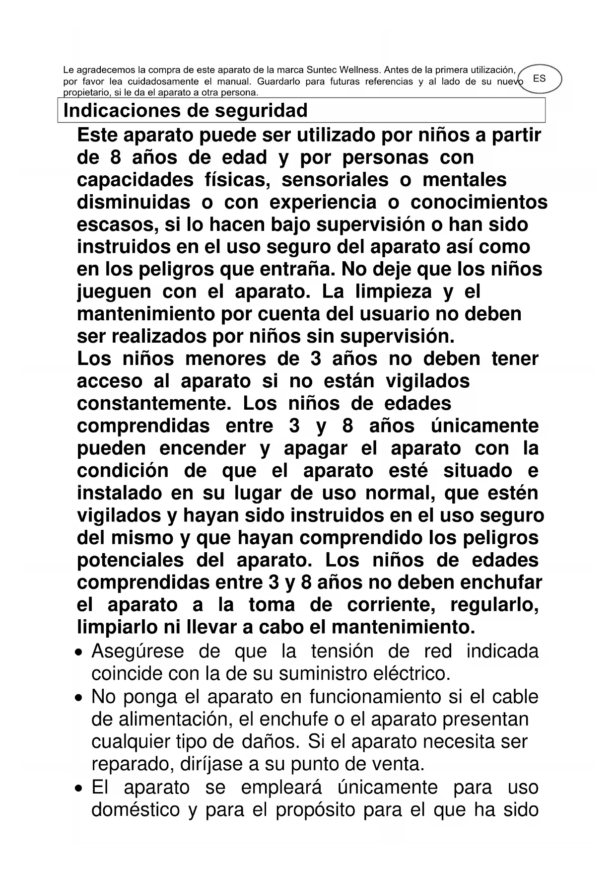 CoolBreeze SUNTEC WELLNESS GMBH / HOLZSTRASSE 2 / 40 221 DÜSSELDORF / GERMANYLe agradecemos la compra de este aparato de la marca Suntec Wellness. Antes de la primera utilización, por favor lea cuidadosamente el manual. Guardarlo para futuras referencias y al lado de su nuevo propietario, si le da el aparato a otra persona. Indicaciones de seguridad Este aparato puede ser utilizado por niños a partir de 8 años de edad y por personas con capacidades físicas, sensoriales o mentales disminuidas o con experiencia o conocimientos escasos, si lo hacen bajo supervisión o han sido instruidos en el uso seguro del aparato así como en los peligros que entraña. No deje que los niños jueguen con el aparato. La limpieza y el mantenimiento por cuenta del usuario no deben ser realizados por niños sin supervisión. Los niños menores de 3 años no deben tener acceso al aparato si no están vigilados constantemente. Los niños de edades comprendidas entre 3 y 8 años únicamente pueden encender y apagar el aparato con la condición de que el aparato esté situado e instalado en su lugar de uso normal, que estén vigilados y hayan sido instruidos en el uso seguro del mismo y que hayan comprendido los peligros potenciales del aparato. Los niños de edades comprendidas entre 3 y 8 años no deben enchufar el aparato a la toma de corriente, regularlo, limpiarlo ni llevar a cabo el mantenimiento.