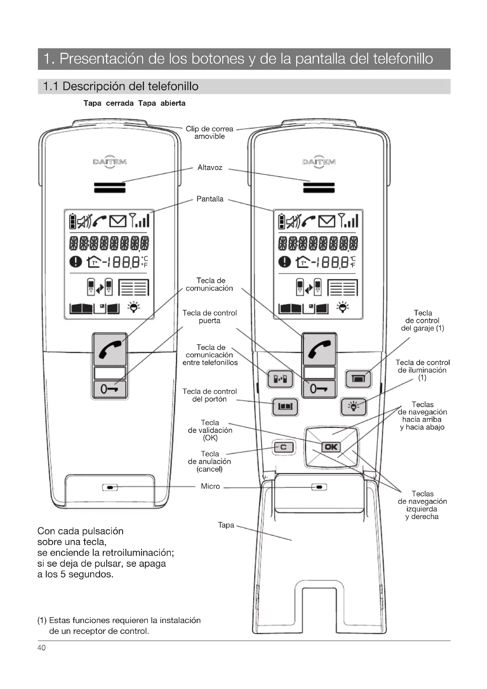 Tapa cerrada Tapa abierta Clip de correa amovible Altavoz Pantalla Tecla de comunicación Tapa Micro Tecla de anulación (cancel) Tecla de validación (OK) Tecla de control del portón Tecla de comunicación entre telefonillos Tecla de control puerta Tecla de control del garaje (1) Tecla de control de iluminación (1) Teclas de navegación hacia arriba y hacia abajo Teclas de navegación izquierda y derecha Con cada pulsación sobre una tecla, se enciende la retroiluminación; si se deja de pulsar, se apaga a los 5 segundos. (1) Estas funciones requieren la instalación de un receptor de control.