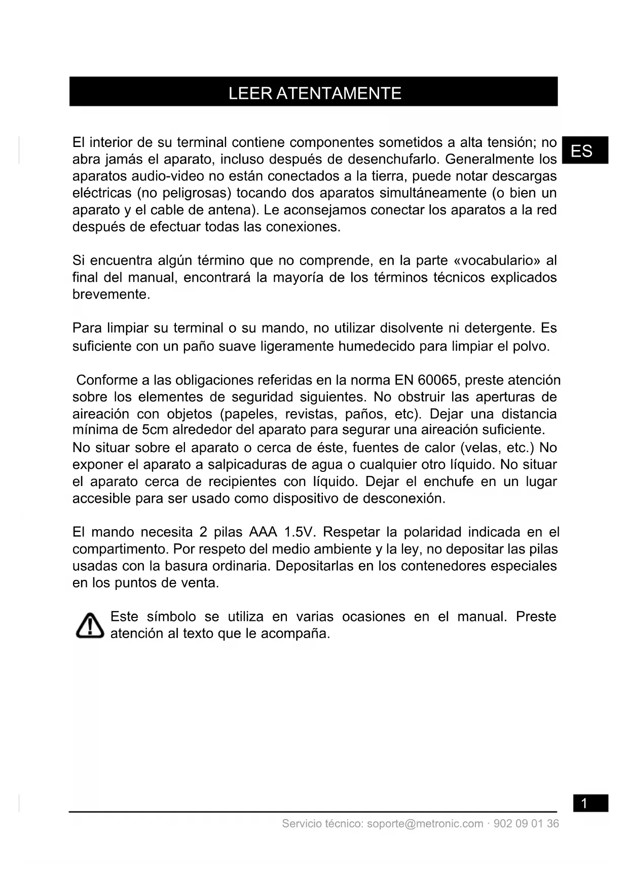 Servicio técnico: soporte@metronic.com · 902 09 01 36 LEER ATENTAMENTE El interior de su terminal contiene componentes sometidos a alta tensión; no abra jamás el aparato, incluso después de desenchufarlo. Generalmente los aparatos audio-video no están conectados a la tierra, puede notar descargas eléctricas (no peligrosas) tocando dos aparatos simultáneamente (o bien un aparato y el cable de antena). Le aconsejamos conectar los aparatos a la red después de efectuar todas las conexiones. Si encuentra algún término que no comprende, en la parte «vocabulario» al final del manual, encontrará la mayoría de los términos técnicos explicados brevemente. Para limpiar su terminal o su mando, no utilizar disolvente ni detergente. Es suficiente con un paño suave ligeramente humedecido para limpiar el polvo. Conforme a las obligaciones referidas en la norma EN 60065, preste atención sobre los elementes de seguridad siguientes. No obstruir las aperturas de aireación con objetos (papeles, revistas, paños, etc). Dejar una distancia mínima de 5cm alrededor del aparato para segurar una aireación suciente. No situar sobre el aparato o cerca de éste, fuentes de calor (velas, etc.) No exponer el aparato a salpicaduras de agua o cualquier otro líquido. No situar el aparato cerca de recipientes con líquido. Dejar el enchufe en un lugar accesible para ser usado como dispositivo de desconexión. El mando necesita 2 pilas AAA 1.5V. Respetar la polaridad indicada en el compartimento. Por respeto del medio ambiente y la ley, no depositar las pilas usadas con la basura ordinaria. Depositarlas en los contenedores especiales en los puntos de venta. Este símbolo se utiliza en varias ocasiones en el manual. Preste atención al texto que le acompaña.2