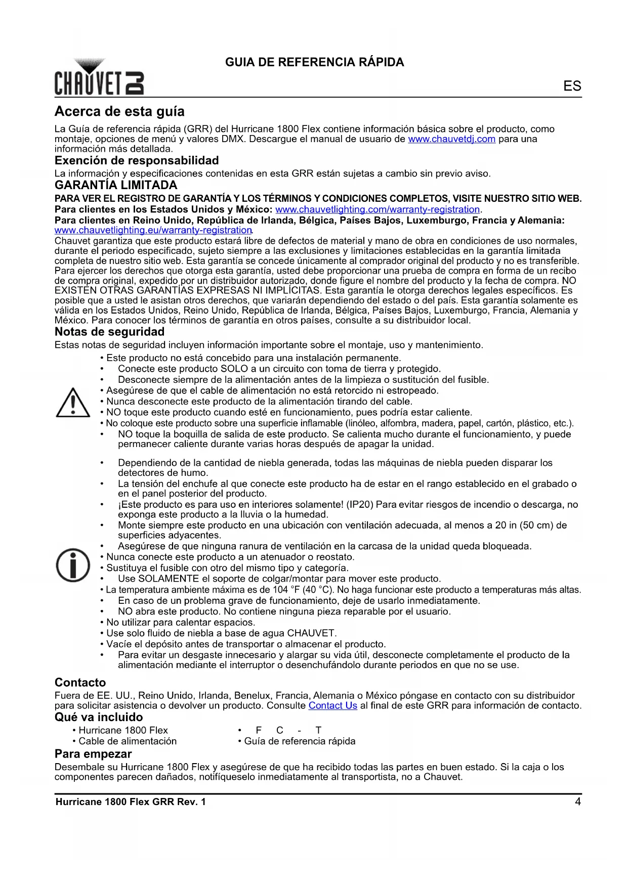 Chauvet garantiza que este producto estará libre de defectos de material y mano de obra en condiciones de uso normales, durante el periodo especificado, sujeto siempre a las exclusiones y limitaciones establecidas en la garantía limitada completa de nuestro sitio web. Esta garantía se concede únicamente al comprador original del producto y no es transferible. Para ejercer los derechos que otorga esta garantía, usted debe proporcionar una prueba de compra en forma de un recibo de compra original, expedido por un distribuidor autorizado, donde figure el nombre del producto y la fecha de compra. NO EXISTEN OTRAS GARANTÍAS EXPRESAS NI IMPLÍCITAS. Esta garantía le otorga derechos legales específicos. Es posible que a usted le asistan otros derechos, que variarán dependiendo del estado o del país. Esta garantía solamente es válida en los Estados Unidos, Reino Unido, República de Irlanda, Bélgica, Países Bajos, Luxemburgo, Francia, Alemania y México. Para conocer los términos de garantía en otros países, consulte a su distribuidor local. Notas de seguridad Estas notas de seguridad incluyen información importante sobre el montaje, uso y mantenimiento. Contacto Fuera de EE. UU., Reino Unido, Irlanda, Benelux, Francia, Alemania o México póngase en contacto con su distribuidor para solicitar asistencia o devolver un producto. Consulte Contact Us al final de este GRR para información de contacto. Qué va incluido Para empezar Desembale su Hurricane 1800 Flex y asegúrese de que ha recibido todas las partes en buen estado. Si la caja o los componentes parecen dañados, notifíqueselo inmediatamente al transportista, no a Chauvet.