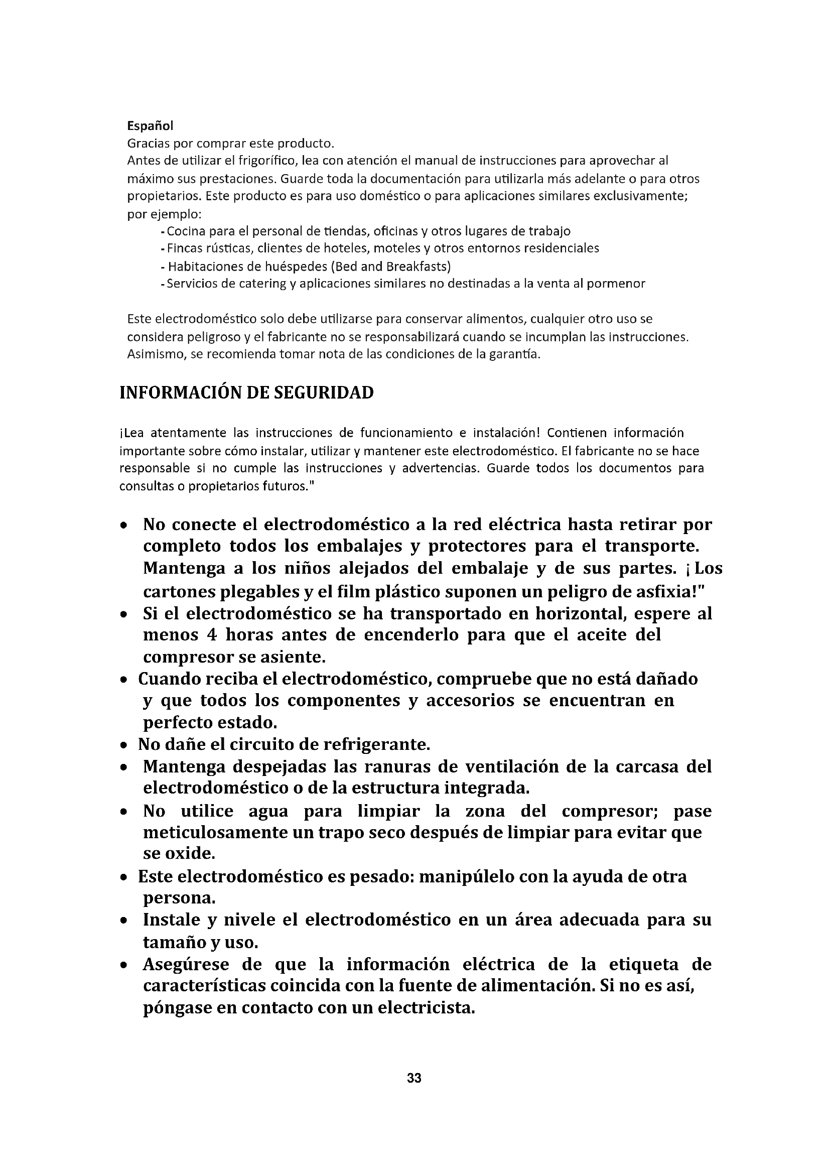¡Lea atentamente las instrucciones de funcionamiento e instalación! Contienen información importante sobre cómo instalar, utilizar y mantener este electrodoméstico. El fabricante no se hace responsable si no cumple las instrucciones y advertencias. Guarde todos los documentos para consultas o propietarios futuros." No conecte el electrodoméstico a la red eléctrica hasta retirar por completo todos los embalajes y protectores para el transporte. Mantenga a los niños alejados del embalaje y de sus partes. ¡Los cartones plegables y el film plástico suponen un peligro de asfixia!" Si el electrodoméstico se ha transportado en horizontal, espere al menos 4 horas antes de encenderlo para que el aceite del compresor se asiente. Cuando reciba el electrodoméstico, compruebe que no está dañado y que todos los componentes y accesorios se encuentran en perfecto estado. No dañe el circuito de refrigerante. Mantenga despejadas las ranuras de ventilación de la carcasa del electrodoméstico o de la estructura integrada. No utilice agua para limpiar la zona del compresor; pase meticulosamente un trapo seco después de limpiar para evitar que se oxide. Este electrodoméstico es pesado: manipúlelo con la ayuda de otra persona. Instale y nivele el electrodoméstico en un área adecuada para su tamaño y uso. Asegúrese de que la información eléctrica de la etiqueta de características coincida con la fuente de alimentación. Si no es así, póngase en contacto con un electricista.34 Este electrodoméstico funciona mediante una fuente de alimentación de 220-240 V CA/50 Hz. Una fluctuación anormal del voltaje puede provocar que el electrodoméstico no se ponga en marcha, o que se dañe el control de temperatura o el compresor, o que se oiga un ruido anormal durante el funcionamiento. En tal caso, se deberá instalar un regulador automático. Solo para el Reino Unido: El cable de alimentación de este electrodoméstico está equipado con un enchufe de 3 cables (a tierra) que se ajusta a una toma de corriente estándar de 3 cables (a tierra). No corte ni desmonte la tercera patilla (toma de tierra). Una vez instalado el electrodoméstico, el enchufe debe ser accesible. Asegúrese de que el cable eléctrico no quede atrapado debajo el electrodoméstico durante y después de su transporte/traslado para evitar cortes o daños en el cable. Para evitar riesgos, el fabricante, su representante de servicio o cualquier otra persona cualificada deben cambiar cualquier cable de alimentación que esté dañado No instale el electrodoméstico en lugares húmedos, con grasa o polvo, ni lo exponga a la luz solar directa y al agua. No instale el electrodoméstico cerca de calentadores o materiales inflamables. PARA electrodomésticos con compartimento congelador: en caso de corte del suministro eléctrico, no abra la puerta. Los alimentos congelados no deben verse afectados si el corte dura menos que las horas indicadas en la etiqueta de valores máximos (tiempo de aumento de la temperatura). Si el corte se prolonga durante más tiempo, deberá procederse a la comprobación de los alimentos y consumirse de inmediato; también se pueden cocinar y volver a congelar. Si le resulta difícil abrir la puerta del electrodoméstico justo después de cerrarla, no se preocupe. Esto se debe a la diferencia de presión que deberá ecualizarse para permitir que la puerta vuelva a abrirse normalmente transcurridos unos minutos. No almacene medicamentos, bacterias ni agentes químicos en el electrodoméstico. Este aparato es un electrodoméstico: no se recomienda almacenar materiales que requieran temperaturas extremas. No tire del cable ni doble demasiado; tampoco debe tocar el enchufe con las manos mojadas. No almacene productos que contengan propelentes inflamables (p.ej.: aerosoles) o sustancias explosivas en el electrodoméstico. ¡ Peligro de explosión!35 No coloque artículos inestables (objetos pesados, recipientes llenos de agua) en la parte superior del frigorífico, a fin de evitar lesiones personales causadas por caídas o descargas eléctricas causadas por el contacto con el agua. No utilice aparatos eléctricos dentro de los compartimentos para la conservación de alimentos del electrodoméstico, a menos que sean del tipo que recomienda el fabricante. Para evitar cortes o lesiones, no toque los elementos internos de refrigeración, sobre todo con las manos húmedas. Aquí están en riesgo los niños, las personas con capacidades físicas, mentales o sensoriales limitadas y las personas con conocimientos inadecuados sobre el funcionamiento seguro de este electrodoméstico. Compruebe que los niños y las personas vulnerables hayan entendido los riesgos. Una persona responsable de la seguridad debe supervisar o instruir a los niños y a las personas vulnerables que utilicen este electrodoméstico. Solo los niños mayores de 8 años pueden usar este electrodoméstico. Los niños no deben jugar con el electrodoméstico Está permitido que los niños de 3 a 8 años de edad carguen o descarguen este aparato. PARA electrodomésticos con compartimento congelador: no almacene líquidos embotellados o enlatados (especialmente bebidas carbonatadas) en el congelador. ¡Las botellas y latas pueden explotar! PARA electrodomésticos con compartimento congelador: nunca se ponga alimentos congelados en la boca directamente desde el congelador. ¡Peligro de quemaduras por baja temperatura! Mantenga las piezas de plástico y la junta de la puerta limpias de aceite y grasa. De lo contrario, las partes plásticas y la junta de la puerta se volverán porosas. Antes de realizar cualquier operación, desconecte el cable eléctrico de la toma de corriente. No utilice aparatos mecánicos ni otros medios para acelerar el proceso de descongelación y siga las recomendaciones del fabricante. No utilice objetos afilados o puntiagudos, como cuchillos o tenedores, para quitar el hielo. Nunca utilice secadores de pelo, calentadores eléctri