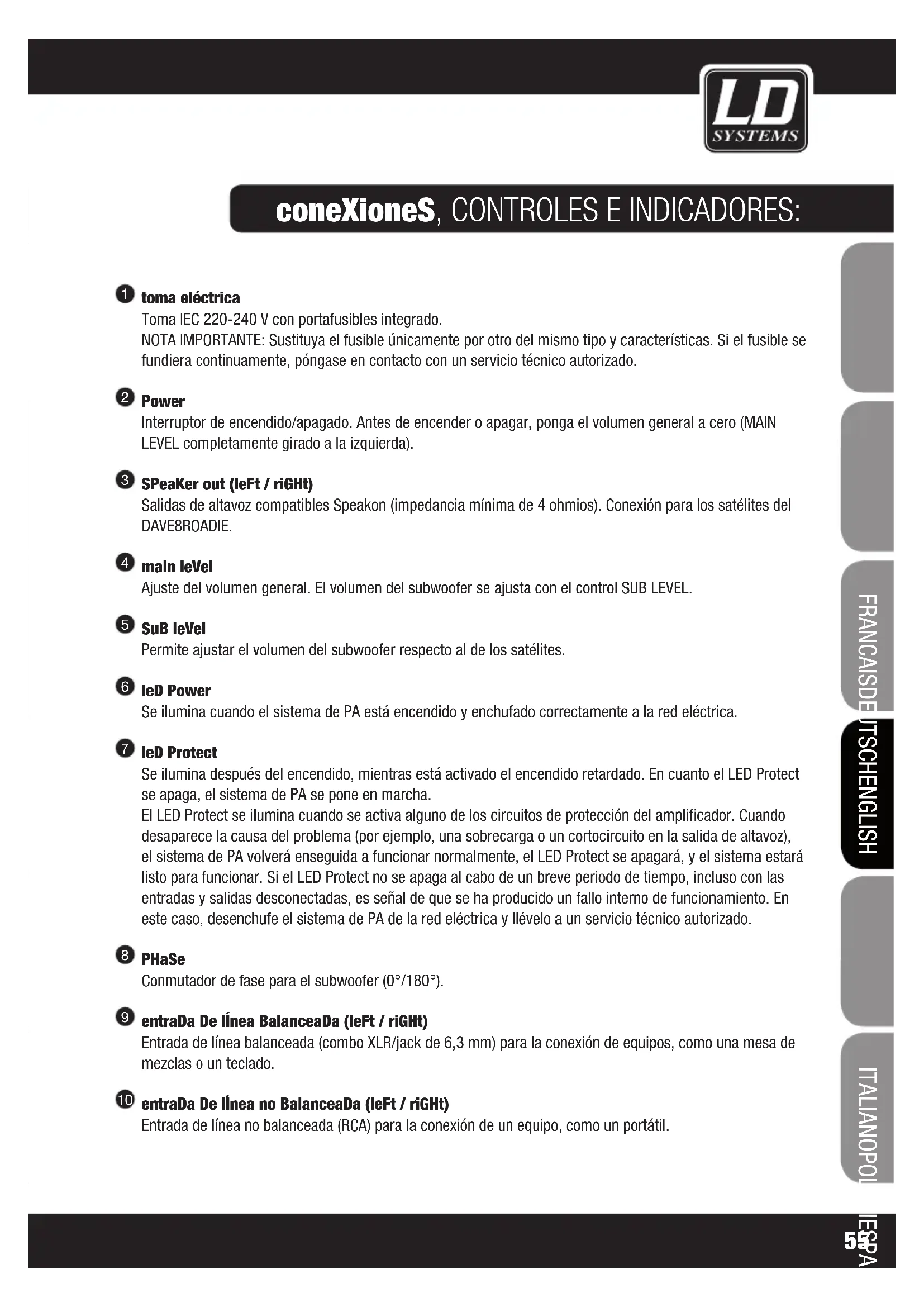 ¡Gracias por elegir LD-Systems! Este equipo está diseñado y fabricado con los estándares de calidad más exigentes, para garantizar un correcto funcionamiento durante muchos años. Los productos de LD-Systems se caracterizan por su gran calidad, avala- da por el prestigio de la marca y una dilatada experiencia como fabricante. Lea atentamente este manual de usuario para poder aprovechar rápidamente toda la funcionalidad de su nuevo producto de LD Systems. Si desea obtener información sobre LD-SYSTEMS, visite nuestro sitio web WWW.lD-SYStemS.COM Introducción El DAVE 8 Roadie de LD Systems es un sistema de PA completo, con un potente amplificador de 350W RMS, que ofrece un rendimiento impresionante en aplicaciones móviles. Está equipado con un potente subwoofer pasa- banda de 8" (150W RMS) y dos satélites de 4"+1" (2x100W) y, con su diseño de sistema de PA compacto y flexible, es especialmente indicado para los músicos. El DAVE 8 Roadie ofrece 3opciones de conexión diferentes que se pueden utilizar simultáneamente: un canal provisto de conectores combo (XLR/jack) para micrófonos dinámicos, un canal provisto de dos conectores RCA para la conexión de ordenadores y de un conector combo (XLR/jack) para mesas de mezclas o teclados, y un tercer canal provisto de entradas jack estéreo de 3,5mm y mono de 6,3mm, para conectar un reproductor MP3 o una guitarra, con un conmutador que permite seleccionar una de estas dos entradas. El potente amplificador de clase AB integrado en el subwoofer alimenta tanto al subwoofer como a los satélites.ITALIANOPOLSKIESPAÑOL FRANCAISFRANCAIS FRANCAISFRANCAIS FRANCAISDEUTSCHENGLISH