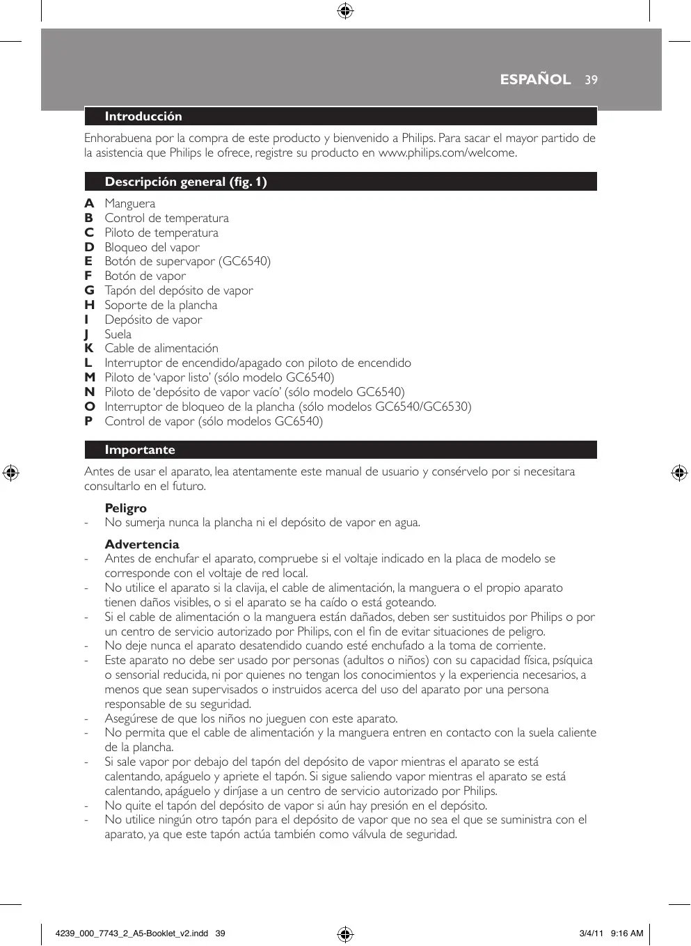 Español 39 Introducción Enhorabuena por la compra de este producto y bienvenido a Philips. Para sacar el mayor partido de la asistencia que Philips le ofrece, registre su producto en www.philips.com/welcome. Descripción general (fig. 1)