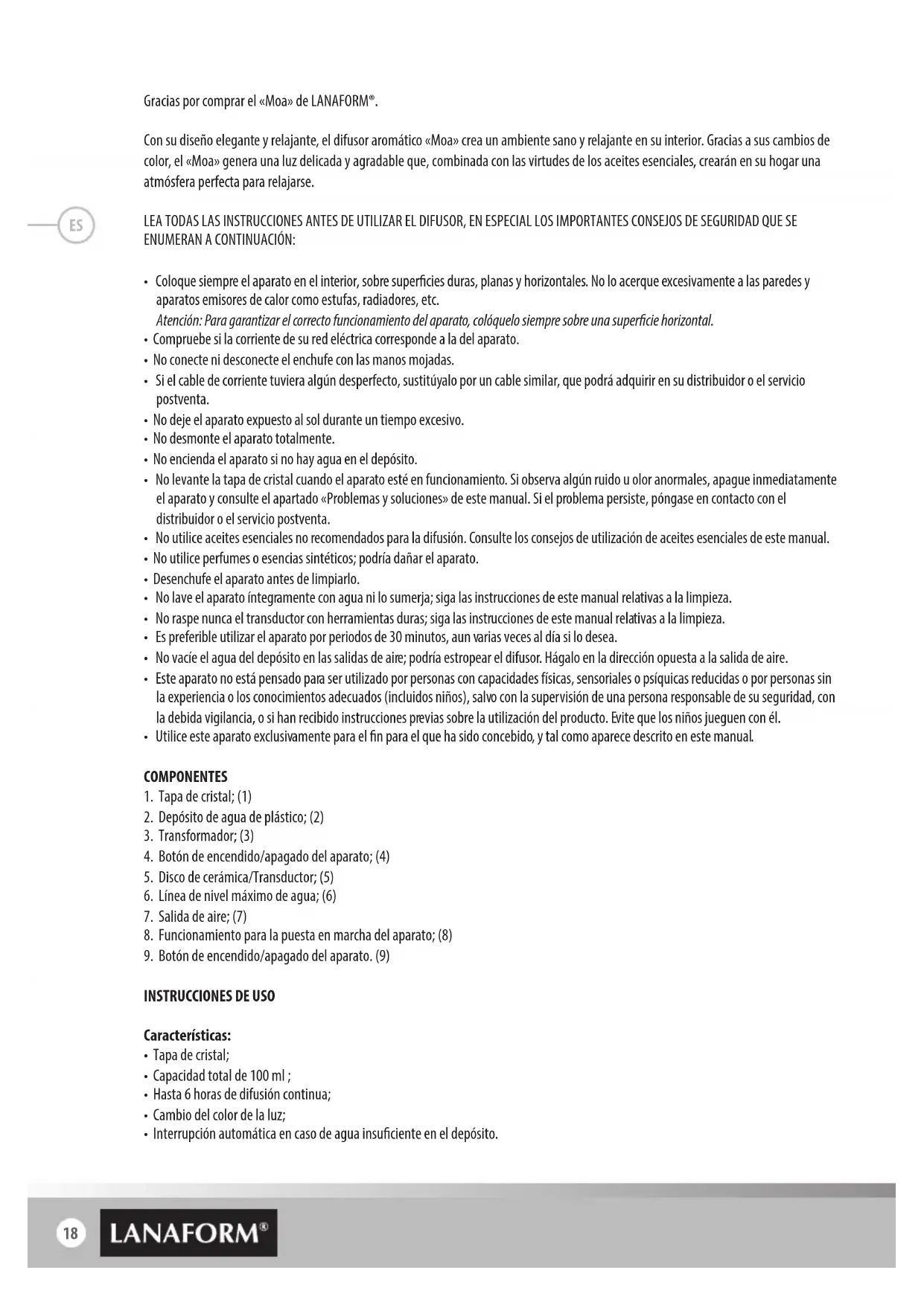 LANAFORM® garantiza que este producto no presenta ningún defecto de material ni de fabricación durante un período de dos años a partir de la fecha de compra, con excepción de los casos que se indican a continuación. La garantía LANAFORM® no cubre los daños debidos a un desgaste normal por el uso del producto. Además, la garantía sobre este pro- ducto LANAFORM® no cubre los daños causados por un uso abusivo o inapropiado, ni en caso de mala utilización, accidente, colocación de un accesorio no autorizado, modicación introducida en el producto o cualquier otra situación, de cualquier naturaleza, ajena al control de LANAFORM®. LANAFORM® no será considerada responsable de ningún tipo de daño indirecto, consecutivo o especial. Todas las garantías implícitas de aptitud del producto se limitan a un período de dos años a partir de la fecha de compra inicial, siempre que pueda presentarse copia del justicante de compra. Una vez recibido el aparato, LANAFORM® procederá a repararlo o sustituirlo, según el caso, y seguidamente se lo devolverá. La garantía solo puede reclamarse a través del Centro de Asistencia Técnica de LANAFORM®. Toda actividad de mantenimiento de este producto no realizada por el Centro de Asistencia Técnica de LANAFORM® anula la presente garantía. ES22 Vielen Dank, dass Sie sich für den Kauf von „Mao“ von LANAFORM® entschieden haben. Mit seinem eleganten und beruhigendem Design bringt der Aromadiusor „Moa“ eine gesunde und entspannende Atmosphäre in Ihr Heim. „Moa“ wechselt die Farbe und schat so ein subtiles und angenehmes Licht, das zusammen mit der Wirkung der ätherischen Öle für eine perfekte Atmosphäre sorgt, damit Sie sich entspannen können. LESEN SIE BITTE ALLE ANWEISUNGEN, BEVOR SIE IHREN DIFFUSOR VERWENDEN; INSBESONDERE DIESE GRUNDLEGENDEN SICHERHEIT- SANWEISUNGEN: