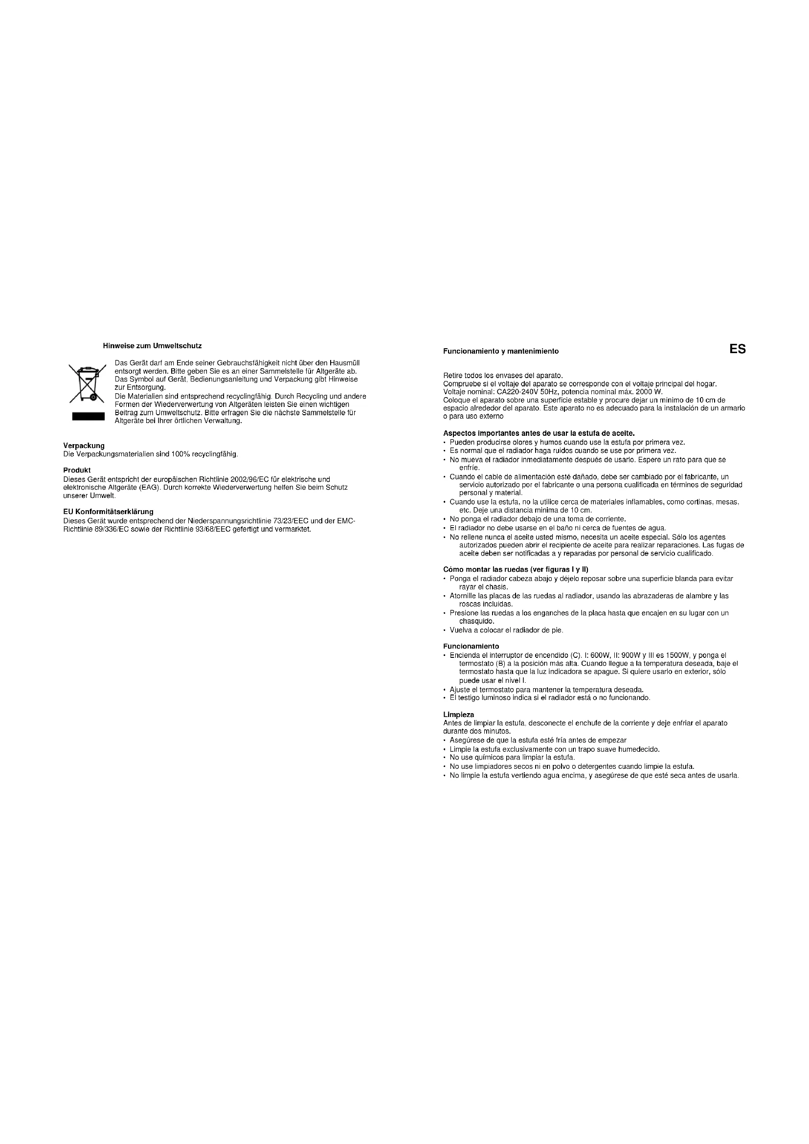 Retire todos los envases del aparato. Compruebe si el voltaje del aparato se corresponde con el voltaje principal del hogar. Voltaje nominal: CA220-240V 50Hz, potencia nominal máx. 2000 W. Coloque el aparato sobre una superficie estable y procure dejar un mínimo de 10 cm de espacio alrededor del aparato. Este aparato no es adecuado para la instalación de un armario o para uso externo Aspectos importantes antes de usar la estufa de aceite.