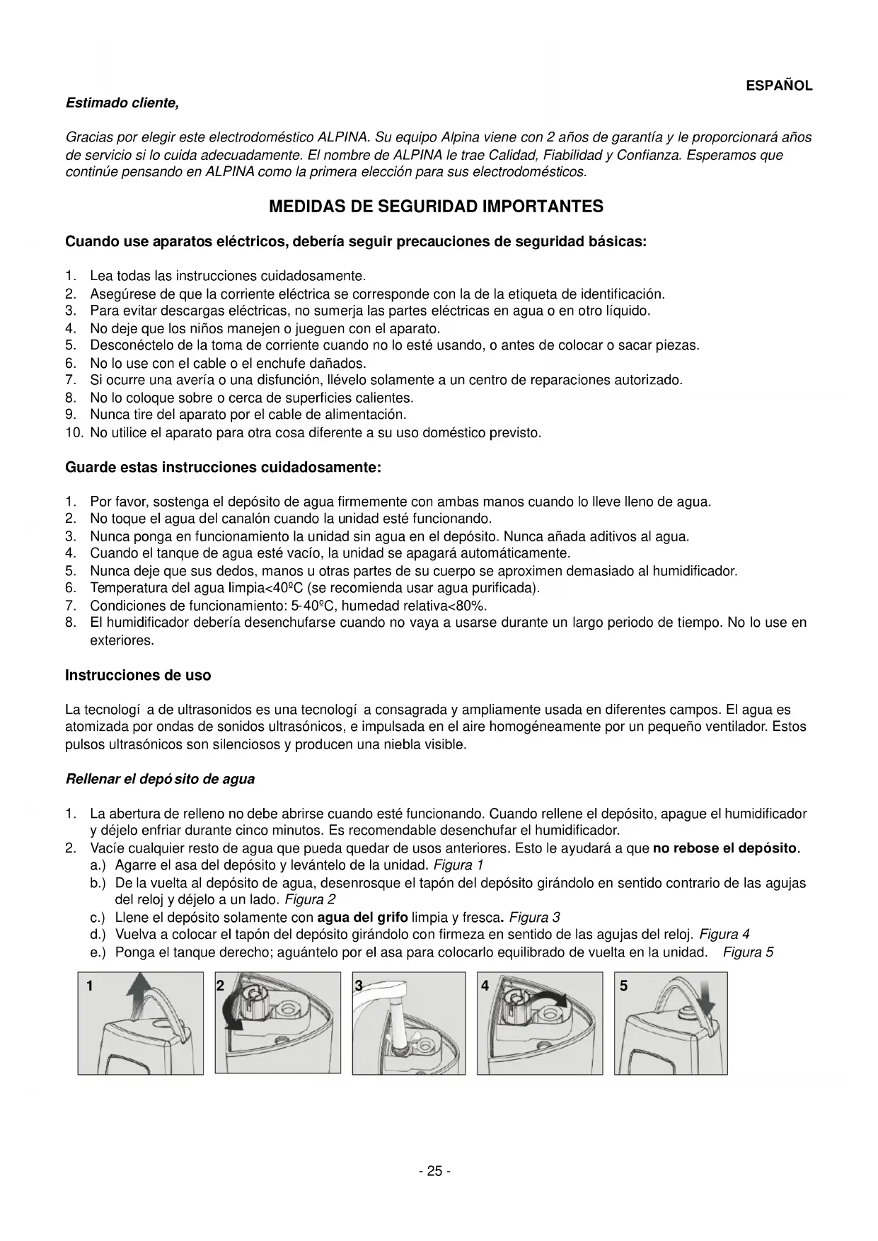 - Nunca ponga en functiomento la unidad sin agua en el deposito. Nunca aada aditivos al agua.