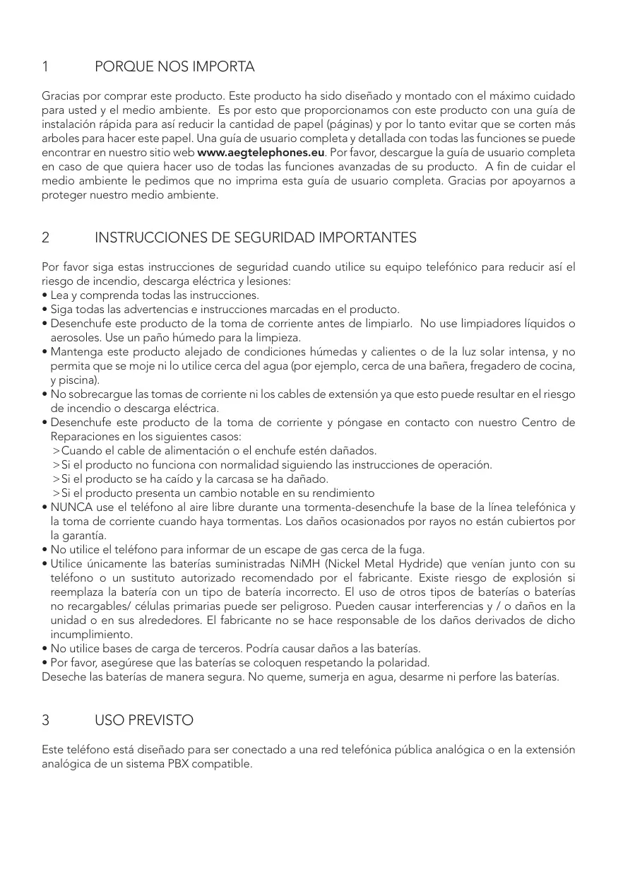 Gracias por comprar este producto. Este producto ha sido diseñado y montado con el máximo cuidado para usted y el medio ambiente. Es por esto que proporcionamos con este producto con una guía de instalación rápida para así reducir la cantidad de papel (páginas) y por lo tanto evitar que se corten más arboles para hacer este papel. Una guía de usuario completa y detallada con todas las funciones se puede encontrar en nuestro sitio web www.aegtelephones.eu. Por favor, descargue la guía de usuario completa en caso de que quiera hacer uso de todas las funciones avanzadas de su producto. A fin de cuidar el medio ambiente le pedimos que no imprima esta guía de usuario completa. Gracias por apoyarnos a proteger nuestro medio ambiente.