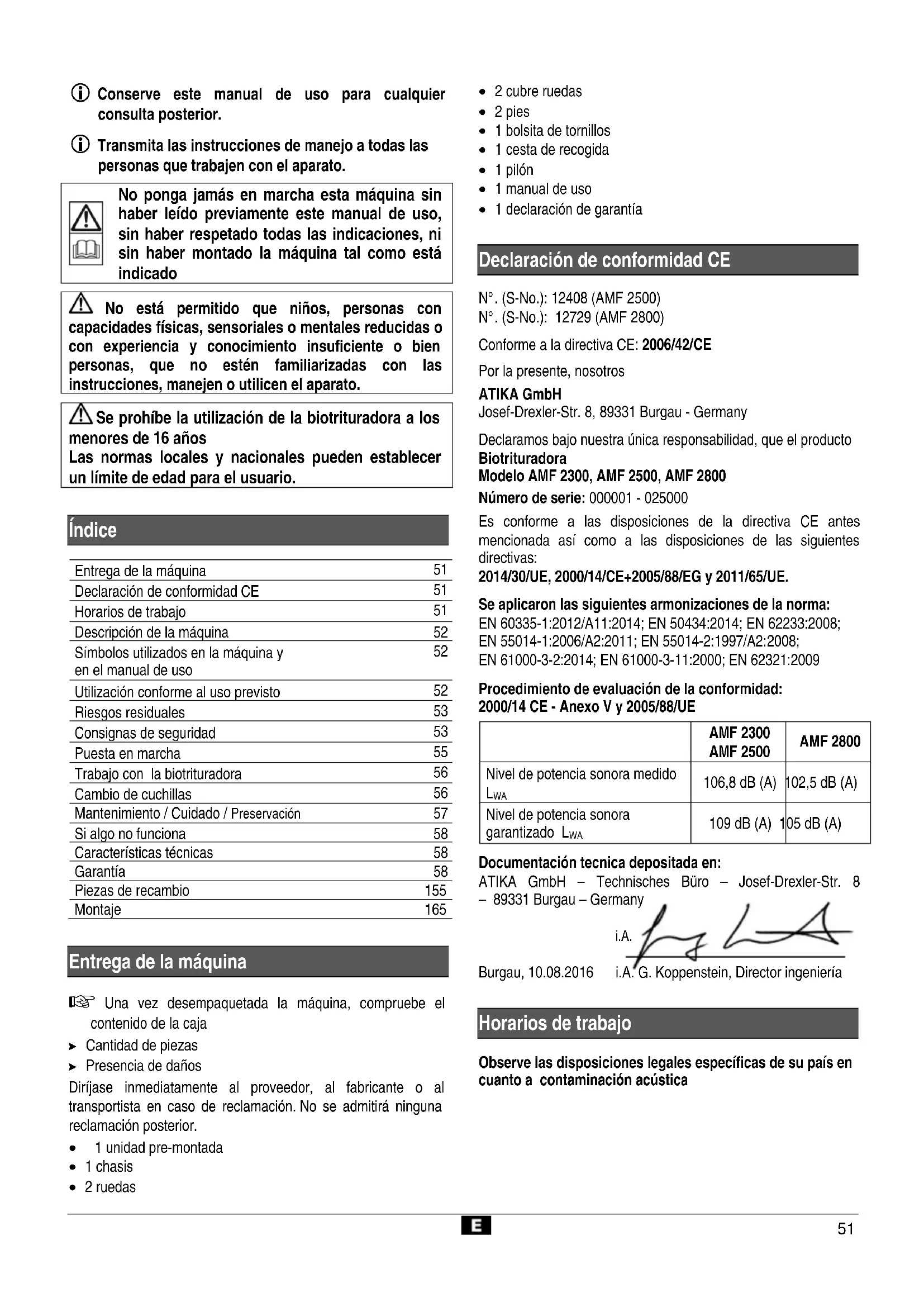 Declaramos bajo nuestra única responsabilidad, que el producto Biotrituradora Modelo AMF 2300, AMF 2500, AMF 2800 Número de serie: 000001 - 025000 Es conforme a las disposiciones de la directiva CE antes mencionada así como a las disposiciones de las siguientes directivas: 2014/30/UE, 2000/14/CE+2005/88/EG y 2011/65/UE. Se aplicaron las siguientes armonizaciones de la norma: EN 60335-1:2012/A11:2014; EN 50434:2014; EN 62233:2008; EN 55014-1:2006/A2:2011; EN 55014-2:1997/A2:2008; EN 61000-3-2:2014; EN 61000-3-11:2000; EN 62321:2009