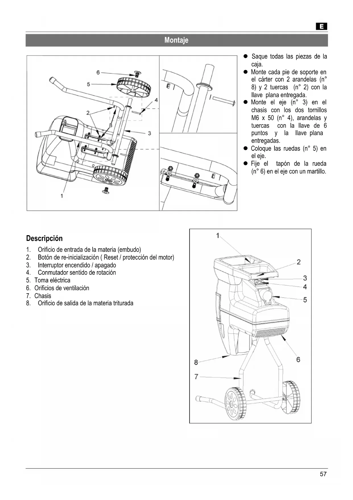 Las ramas largas que sobresalen de la máquina pueden ir hacia aras. Respete la distancia de seguridad No ponga jamás las manos en los orificios de la máquina mientras esté funcionando Mantenga cuerpo y cara a cierta distancia del orificio de entrada No introduzca jamás las manos ni ninguna otra parte del cuerpo, ni de su ropa o pelo, en el orificio de entrada de la materia. Aléjese también de las piezas móviles en movimiento. Antes de poner en marcha la biotrituradaora compruebe que no queden restos triturados dentro del embudo No vuelque o transporte (cambio de emplazamiento) el aparato con el motor en marcha. Preste atención a que el motor esté libre de residuos y otras acumulaciones para preservar el motor de daños o de un posible fuego. Botón de reinicio