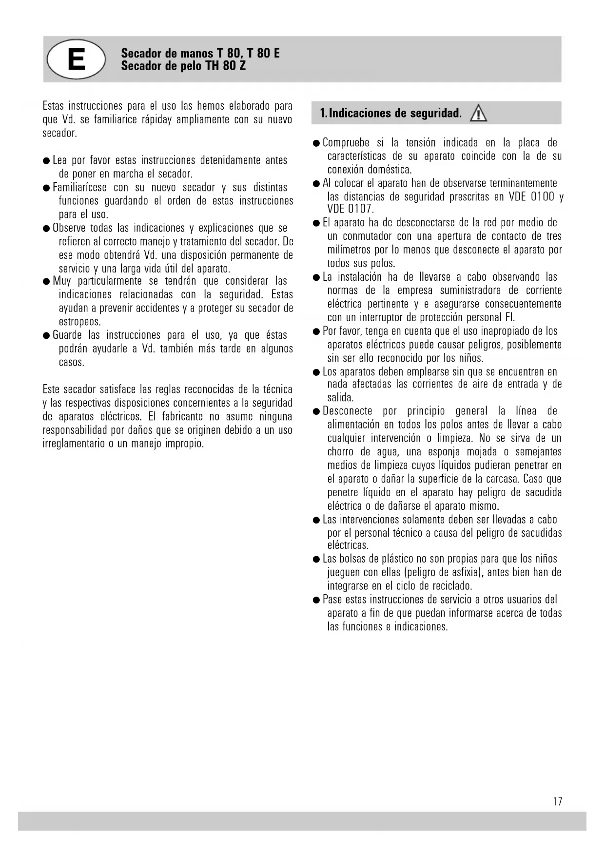Este secador satisface las reglas reconocidas de la técnica y las respectivas disposiciones concernientes a la seguridad de aparatos eléctricos. El fabricante no asume ninguna responsabilidad por daños que se originen debido a un uso irreglamentario o un manejo impropio.
