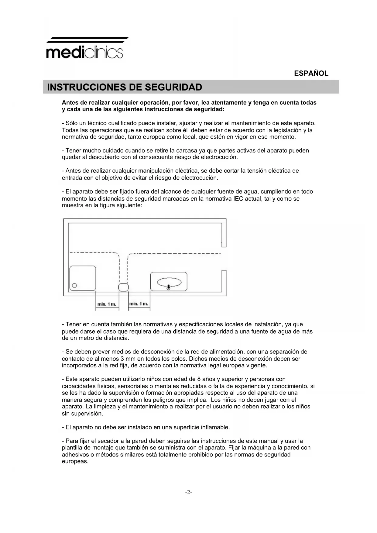 - El aparato incorpora un filtro tipo HEPA en la zona de aspiración, cuyo estado debe revisarse periódicamente. El alojamiento del filtro de entrada de aire permite una fácil extracción y sustitución. Opcionalmente, en la zona de aspiración puede incorporarse una pastilla desodorante. Instalación SÓLO UN TÉCNICO CUALIFICADO PUEDE REALIZAR LA INSTALACIÓN, LOS AJUSTES NECESARIOS Y EL MANTENIMIENTO DE ESTA SECADORA DE MANOS. La instalación de esta secadora de manos solamente se puede hacer si la instalación eléctrica a la cual se va a conectar es fija. Al llevar a cabo esta conexión se deben prever medios de desconexión de la red de alimentación, con una separación de contacto de al menos 3 mm (0.12”) en todos los polos. El instalador debe asegurarse que la instalación eléctrica está conectada a tierra de acuerdo con la legislación y normativa vigentes y que dispone de un interruptor de alta sensibilidad I n ≤ 0.03 A. La máquina deberá estar desconectada de la tensión principal de entrada, antes de realizar cualquier operación de mantenimiento. Para instalar el secador de manos seguir las indicaciones mostradas en la figura 2. La máquina se fijará a la pared exclusivamente con el soporte de fijación a pared suministrado con el secador de manos. INSTALACIÓN Y MANTENIMIENTO PARA EL PERSONAL TÉCNICOwww.mediclinics.com