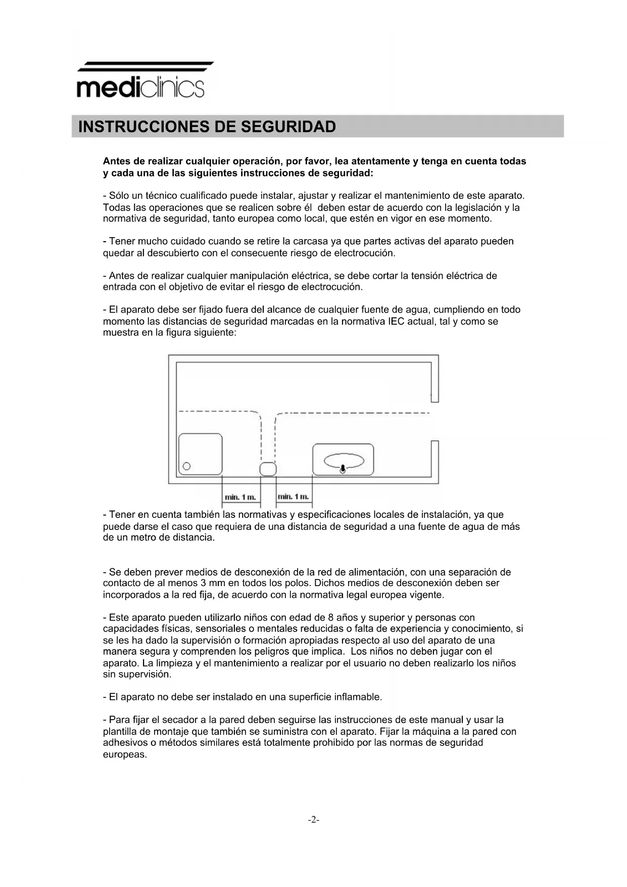 - Se deben prever medios de desconexión de la red de alimentación, con una separación de contacto de al menos 3 mm en todos los polos. Dichos medios de desconexión deben ser incorporados a la red fija, de acuerdo con la normativa legal europea vigente. - Este aparato pueden utilizarlo niños con edad de 8 años y superior y personas con capacidades físicas, sensoriales o mentales reducidas o falta de experiencia y conocimiento, si se les ha dado la supervisión o formación apropiadas respecto al uso del aparato de una manera segura y comprenden los peligros que implica. Los niños no deben jugar con el aparato. La limpieza y el mantenimiento a realizar por el usuario no deben realizarlo los niños sin supervisión. - El aparato no debe ser instalado en una superficie inflamable. - Para fijar el secador a la pared deben seguirse las instrucciones de este manual y usar la plantilla de montaje que también se suministra con el aparato. Fijar la máquina a la pared con adhesivos o métodos similares está totalmente prohibido por las normas de seguridad europeas.