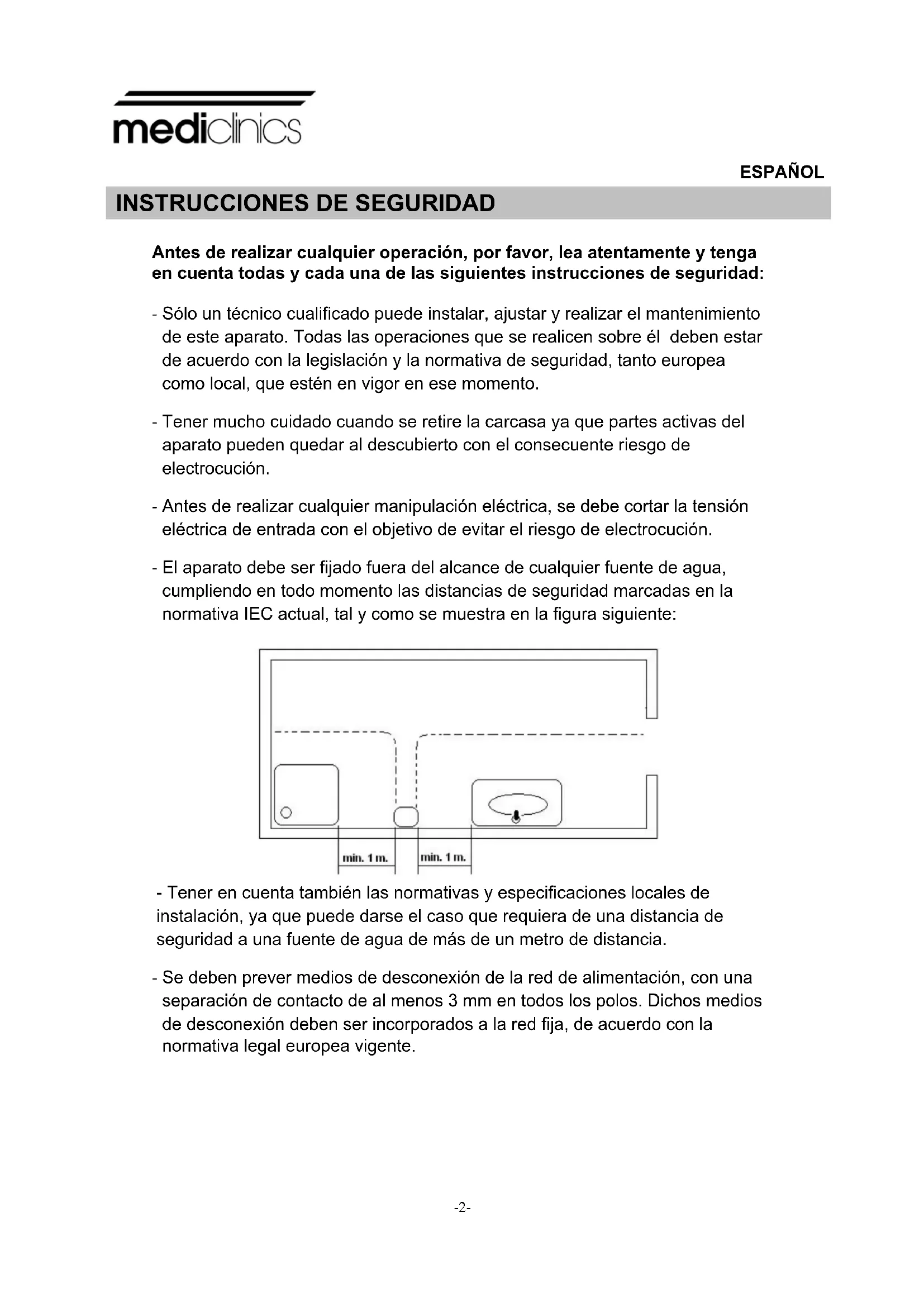 Antes de realizar cualquier operación, por favor, lea atentamente y tenga en cuenta todas y cada una de las siguientes instrucciones de seguridad: - Sólo un técnico cualificado puede instalar, ajustar y realizar el mantenimiento de este aparato. Todas las operaciones que se realicen sobre él deben estar de acuerdo con la legislación y la normativa de seguridad, tanto europea como local, que estén en vigor en ese momento. - Tener mucho cuidado cuando se retire la carcasa ya que partes activas del aparato pueden quedar al descubierto con el consecuente riesgo de electrocución. - Antes de realizar cualquier manipulación eléctrica, se debe cortar la tensión eléctrica de entrada con el objetivo de evitar el riesgo de electrocución. - El aparato debe ser fijado fuera del alcance de cualquier fuente de agua, cumpliendo en todo momento las distancias de seguridad marcadas en la normativa IEC actual, tal y como se muestra en la figura siguiente: - Tener en cuenta también las normativas y especificaciones locales de instalación, ya que puede darse el caso que requiera de una distancia de seguridad a una fuente de agua de más de un metro de distancia. - Se deben prever medios de desconexión de la red de alimentación, con una separación de contacto de al menos 3 mm en todos los polos. Dichos medios de desconexión deben ser incorporados a la red fija, de acuerdo con la normativa legal europea vigente.