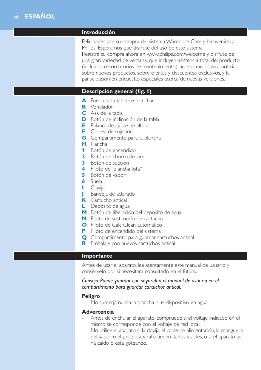 Español Introducción Felicidades por su compra del sistema Wardrobe Care y bienvenido a Philips! Esperamos que disfrute del uso de este sistema. Registre su compra ahora en www.philips.com/welcome y disfrute de una gran variedad de ventajas, que incluyen asistencia total del producto (incluidos recordatorios de mantenimiento), acceso exclusivo a noticias sobre nuevos productos, sobre ofertas y descuentos exclusivos, y la participación en encuestas especiales acerca de nuevas versiones. Descripción general (fig. 1) A B C D E F G H 1 2 3 4 5 6