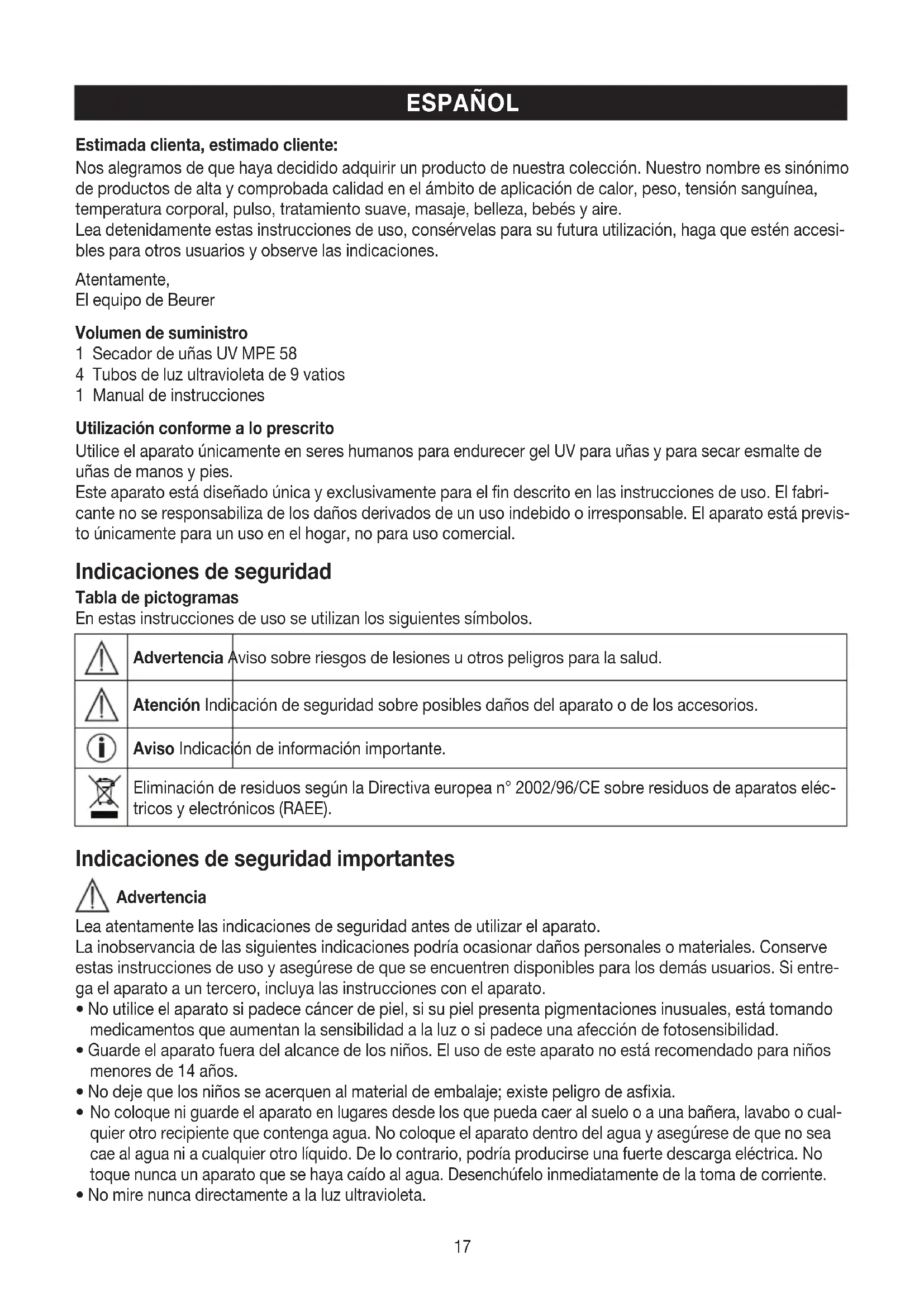 N° du modèle MPE 58 Dimensions L220 x I210 x H100 mm Poids 1632 g Alimentation électrique 220 – 240 V, ~ 50/60 Hz Puissance nominale 40 W Conditions de conservation admissibles Conserver dans un endroit sec et propre Nombre de lampes à UV 4 Type de lampes à UV UV-9 W-L 365 nm, 9W Type UV de l’appareil Lampe UV-A Type 3 Temps de coupure 90secondes, 120secondes, utilisation continue17 Estimada clienta, estimado cliente: Nos alegramos de que haya decidido adquirir un producto de nuestra colección. Nuestro nombre es sinónimo de productos de alta y comprobada calidad en el ámbito de aplicación de calor, peso, tensión sanguínea, temperatura corporal, pulso, tratamiento suave, masaje, belleza, bebés y aire. Lea detenidamente estas instrucciones de uso, consérvelas para su futura utilización, haga que estén accesi- bles para otros usuarios y observe las indicaciones. Atentamente, El equipo de Beurer Volumen de suministro 1 Secador de uñas UV MPE 58 4 Tubos de luz ultravioleta de 9 vatios 1 Manual de instrucciones Utilización conforme a lo prescrito Utilice el aparato únicamente en seres humanos para endurecer gel UV para uñas y para secar esmalte de uñas de manos y pies. Este aparato está diseñado única y exclusivamente para el fin descrito en las instrucciones de uso. El fabri- cante no se responsabiliza de los daños derivados de un uso indebido o irresponsable. El aparato está previs- to únicamente para un uso en el hogar, no para uso comercial. Indicaciones de seguridad Tabla de pictogramas En estas instrucciones de uso se utilizan los siguientes símbolos. Advertencia Aviso sobre riesgos de lesiones u otros peligros para la salud. Atención Indicación de seguridad sobre posibles daños del aparato o de los accesorios. Aviso Indicación de información importante. Eliminación de residuos según la Directiva europea n° 2002/96/CE sobre residuos de aparatos eléc- tricos y electrónicos (RAEE). Indicaciones de seguridad importantes Advertencia Lea atentamente las indicaciones de seguridad antes de utilizar el aparato. La inobservancia de las siguientes indicaciones podría ocasionar daños personales o materiales. Conserve estas instrucciones de uso y asegúrese de que se encuentren disponibles para los demás usuarios. Si entre- ga el aparato a un tercero, incluya las instrucciones con el aparato.
