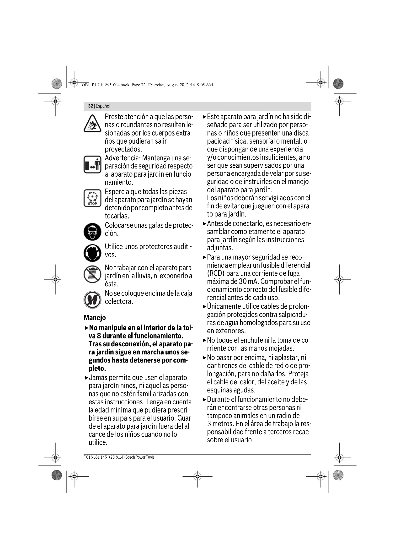 PRECAUCIÓN: Los cables de prolongación no regla- mentarios pueden resultar peligrosos. Los cables de prolongación, enchufes y empalmes deberán ser estan- cos al agua y aptos para su uso a la intemperie. Los conectores de empalme de los cables deberán estar se- cos y no deberán tocar el suelo. Para una mayor seguridad se recomienda emplear un fusible diferencial (RCD) para una corriente de fuga máxima de 30 mA. Comprobar el funcionamiento correcto del fusible di- ferencial antes de cada uso. En caso de estar dañado el cable de conexión, éste solamente deberá hacerse reparar en un taller de servicio autorizado Bosch. Los tambores para cables deberán desenrollarse antes de su uso. El enchufe macho de conexión, debe ser conectado so- lamente a un enchufe hembra de las mismas caracteris- ticas técnicas del enchufe macho en materia. Montaje Saque el aparato para jardín del embalaje. (ver figuras A–D). Montaje de la tolva (ver figuras E–F) Operación Puesta en marcha (ver figura G) Siempre coloque el aparato para jardín sobre un firme horizontal y consistente. No incline ni mueva el aparato para jardín mientras éste esté funcionando. ¡Tras su desconexión, el motor sigue girando cierto tiempo hasta detenerse del todo! Desprenda la tierra adherida a las raíces. Evite que penetren por la tolva 8 cuerpos extraños como piedras, vidrio, metales y plásticos. De lo contrario el cilindro de corte 16 podría da- ñarse. La tolva 8 deberá estar vacía. Conexión Accione el botón verde 4. Desconexión Presione el botón rojo “Stop” 5. Esperar 2 s antes de volver a arrancar el aparato para jardín. 3 600 ... H03 0.. H03 1.. H03 2.. H03 3.. Declaramos bajo nuestra exclusiva responsabilidad, que el producto descrito en los “Da- tos técnicos” cumple con todas las disposiciones correspondientes de las directivas 2011/65/UE, 2014/30/UE, 2006/42/CE, 2000/14/CE inclusive sus modificaciones y está en conformidad con las siguientes normas: EN 60335-1, EN 50434. 2000/14/CE: Nivel de potencia acústica garantizado: Procedimiento para evaluación de la conformidad según anexo V. dB(A) 92 92 Henk Becker Executive Vice President Engineering Helmut Heinzelmann Head of Product Certification PT/ETM9 Abra hacia atrás la trampilla del mecanismo de corte
