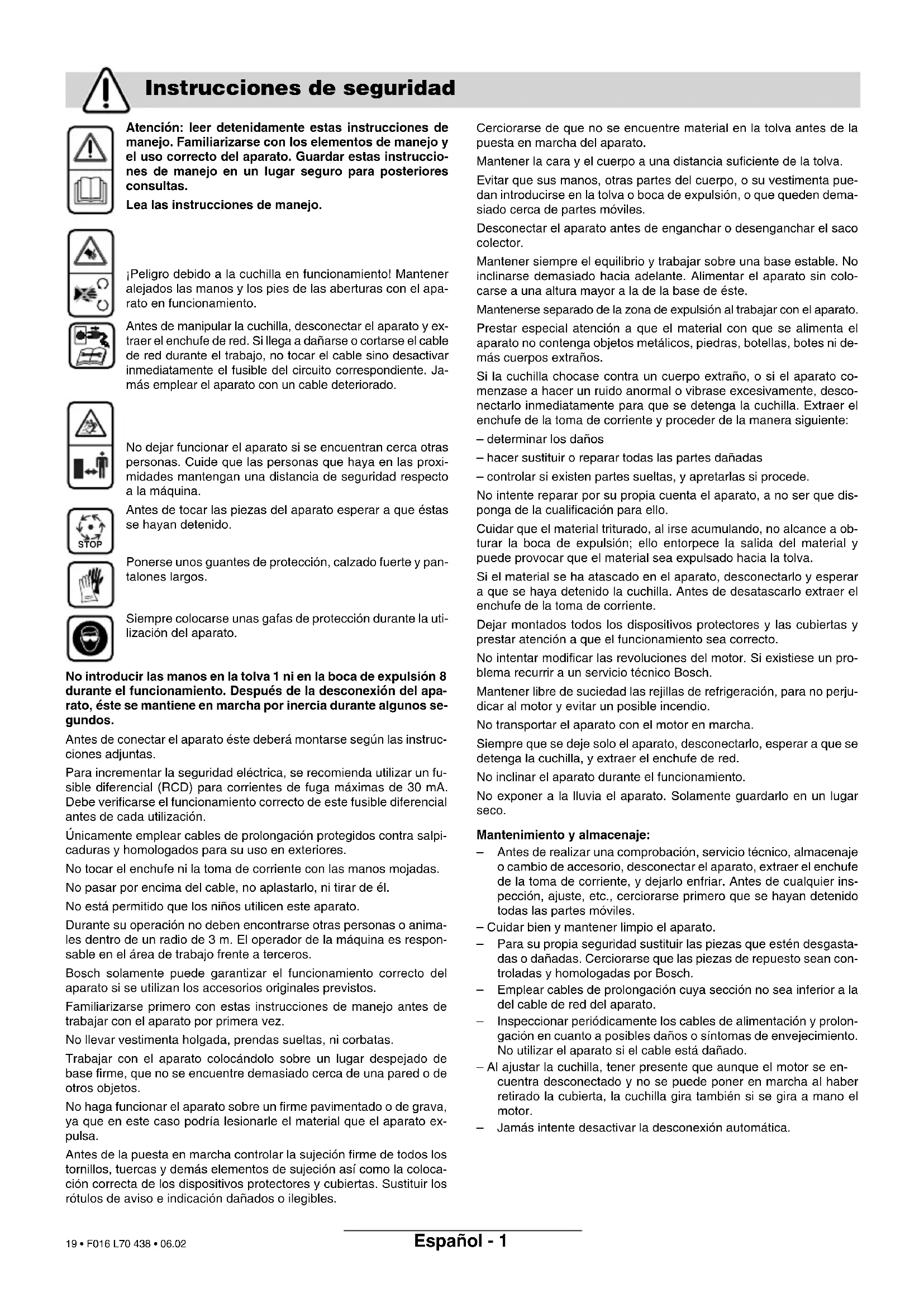 Déclaration de conformité F016 L70 438 - F Seite 5 Dienstag, 28. Februar 2006 3:48 15 18 • F016 L70 438 • 06.02Español - 1 Atención: leer detenidamente estas instrucciones de manejo. Familiarizarse con los elementos de manejo y el uso correcto del aparato. Guardar estas instruccio- nes de manejo en un lugar seguro para posteriores consultas. Lea las instrucciones de manejo. ¡Peligro debido a la cuchilla en funcionamiento! Mantener alejados las manos y los pies de las aberturas con el apa- rato en funcionamiento. Antes de manipular la cuchilla, desconectar el aparato y ex- traer el enchufe de red. Si llega a dañarse o cortarse el cable de red durante el trabajo, no tocar el cable sino desactivar inmediatamente el fusible del circuito correspondiente. Ja- más emplear el aparato con un cable deteriorado. No dejar funcionar el aparato si se encuentran cerca otras personas. Cuide que las personas que haya en las proxi- midades mantengan una distancia de seguridad respecto a la máquina. Antes de tocar las piezas del aparato esperar a que éstas se hayan detenido. Ponerse unos guantes de protección, calzado fuerte y pan- talones largos. Siempre colocarse unas gafas de protección durante la uti- lización del aparato. No introducir las manos en la tolva 1 ni en la boca de expulsión 8 durante el funcionamiento. Después de la desconexión del apa- rato, éste se mantiene en marcha por inercia durante algunos se- gundos. Antes de conectar el aparato éste deberá montarse según las instruc- ciones adjuntas. Para incrementar la seguridad eléctrica, se recomienda utilizar un fu- sible diferencial (RCD) para corrientes de fuga máximas de 30 mA. Debe verificarse el funcionamiento correcto de este fusible diferencial antes de cada utilización. Únicamente emplear cables de prolongación protegidos contra salpi- caduras y homologados para su uso en exteriores. No tocar el enchufe ni la toma de corriente con las manos mojadas. No pasar por encima del cable, no aplastarlo, ni tirar de él. No está permitido que los niños utilicen este aparato. Durante su operación no deben encontrarse otras personas o anima- les dentro de un radio de 3 m. El operador de la máquina es respon- sable en el área de trabajo frente a terceros. Bosch solamente puede garantizar el funcionamiento correcto del aparato si se utilizan los accesorios originales previstos. Familiarizarse primero con estas instrucciones de manejo antes de trabajar con el aparato por primera vez. No llevar vestimenta holgada, prendas sueltas, ni corbatas. Trabajar con el aparato colocándolo sobre un lugar despejado de base firme, que no se encuentre demasiado cerca de una pared o de otros objetos. No haga funcionar el aparato sobre un firme pavimentado o de grava, ya que en este caso podría lesionarle el material que el aparato ex- pulsa. Antes de la puesta en marcha controlar la sujeción firme de todos los tornillos, tuercas y demás elementos de sujeción así como la coloca- ción correcta de los dispositivos protectores y cubiertas. Sustituir los rótulos de aviso e indicación dañados o ilegibles. Cerciorarse de que no se encuentre material en la tolva antes de la puesta en marcha del aparato. Mantener la cara y el cuerpo a una distancia suficiente de la tolva. Evitar que sus manos, otras partes del cuerpo, o su vestimenta pue- dan introducirse en la tolva o boca de expulsión, o que queden dema- siado cerca de partes móviles. Desconectar el aparato antes de enganchar o desenganchar el saco colector. Mantener siempre el equilibrio y trabajar sobre una base estable. No inclinarse demasiado hacia adelante. Alimentar el aparato sin colo- carse a una altura mayor a la de la base de éste. Mantenerse separado de la zona de expulsión al trabajar con el aparato. Prestar especial atención a que el material con que se alimenta el aparato no contenga objetos metálicos, piedras, botellas, botes ni de- más cuerpos extraños. Si la cuchilla chocase contra un cuerpo extraño, o si el aparato co- menzase a hacer un ruido anormal o vibrase excesivamente, desco- nectarlo inmediatamente para que se detenga la cuchilla. Extraer el enchufe de la toma de corriente y proceder de la manera siguiente: – determinar los daños – hacer sustituir o reparar todas las partes dañadas – controlar si existen partes sueltas, y apretarlas si procede. No intente reparar por su propia cuenta el aparato, a no ser que dis- ponga de la cualificación para ello. Cuidar que el material triturado, al irse acumulando, no alcance a ob- turar la boca de expulsión; ello entorpece la salida del material y puede provocar que el material sea expulsado hacia la tolva. Si el material se ha atascado en el aparato, desconectarlo y esperar a que se haya detenido la cuchilla. Antes de desatascarlo extraer el enchufe de la toma de corriente. Dejar montados todos los dispositivos protectores y las cubiertas y prestar atención a que el funcionamiento sea correcto. No intentar modificar las revoluciones del motor. Si existiese un pro- blema recurrir a un servicio técnico Bosch. Mantener libre de suciedad las rejillas de refrigeración, para no perju- dicar al motor y evitar un posible incendio. No transportar el aparato con el motor en marcha. Siempre que se deje solo el aparato, desconectarlo, esperar a que se detenga la cuchilla, y extraer el enchufe de red. No inclinar el aparato durante el funcionamiento. No exponer a la lluvia el aparato. Solamente guardarlo en un lugar seco. Mantenimiento y almacenaje: – Antes de realizar una comprobación, servicio técnico, almacenaje o cambio de accesorio, desconectar el aparato, extraer el enchufe de la toma de corriente, y dejarlo enfriar. Antes de cualquier ins- pección, ajuste, etc., cerciorarse primero que se hayan detenido todas las partes móviles. – Cuidar bien y mantener limpio el aparato. – Para su propia seguridad sustituir las piezas que estén desgasta- das o dañadas. Cerciorarse que las piezas de repue