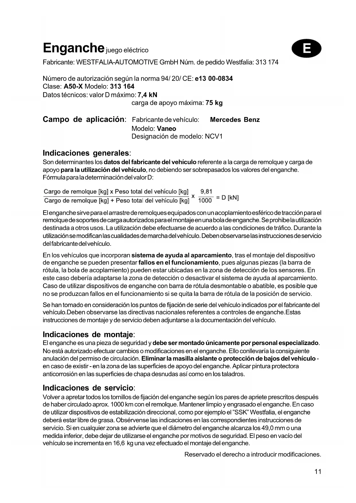 med en dampstråler skal kuglestangen tages af og lukkeproppen skal sættes i. (Kuglestangen må ikke bestråles med damp).11 Enganche juego eléctrico Fabricante: WESTFALIA-AUTOMOTIVE GmbH Núm. de pedido Westfalia: 313 174 Número de autorización según la norma 94/ 20/ CE: e13 00-0834 Clase: A50-X Modelo: 313 164 Datos técnicos: valor D máximo: 7,4 kN carga de apoyo máxima: 75 kg Campo de aplicación: Fabricante de vehículo: Mercedes Benz Modelo: Vaneo Designación de modelo: NCV1 Indicaciones generales: Son determinantes los datos del fabricante del vehículo referente a la carga de remolque y carga de apoyo para la utilización del vehículo, no debiendo ser sobrepasados los valores del enganche. Fórmula para la determinación del valor D: El enganche sirve para el arrastre de remolques equipados con un acoplamiento esférico de tracción para el remolque de soportes de carga autorizados para el montaje en una bola de enganche. Se prohibe la utilización destinada a otros usos. La utilización debe efectuarse de acuerdo a las condiciones de tráfico. Durante la utilización se modifican las cualidades de marcha del vehículo. Deben observarse las instrucciones de servicio del fabricante del vehículo. En los vehículos que incorporan sistema de ayuda al aparcamiento, tras el montaje del dispositivo de enganche se pueden presentar fallos en el funcionamiento, pues algunas piezas (la barra de rótula, la bola de acoplamiento) pueden estar ubicadas en la zona de detección de los sensores. En este caso debería adaptarse la zona de detección o desactivar el sistema de ayuda al aparcamiento. Caso de utilizar dispositivos de enganche con barra de rótula desmontable o abatible, es posible que no se produzcan fallos en el funcionamiento si se quita la barra de rótula de la posición de servicio. Se han tomado en consideración los puntos de fijación de serie del vehículo indicados por el fabricante del vehículo.Deben observarse las directivas nacionales referentes a controles de enganche.Estas instrucciones de montaje y de servicio deben adjuntarse a la documentación del vehículo. Indicaciones de montaje: El enganche es una pieza de seguridad y debe ser montado únicamente por personal especializado. No está autorizado efectuar cambios o modificaciones en el enganche. Ello conllevaría la consiguiente anulación del permiso de circulación. Eliminar la masilla aislante o protección de bajos del vehículo - en caso de existir - en la zona de las superficies de apoyo del enganche. Aplicar pintura protectora anticorrosión en las superficies de chapa desnudas así como en los taladros. Indicaciones de servicio: Volver a apretar todos los tornillos de fijación del enganche según los pares de apriete prescritos después de haber circulado aprox. 1000 km con el remolque. Mantener limpio y engrasado el enganche. En caso de utilizar dispositivos de estabilización direccional, como por ejemplo el ”SSK” Westfalia, el enganche deberá estar libre de grasa. Obsérvense las indicaciones en las correspondientes instrucciones de servicio. Si en cualquier zona se advierte que el diámetro del enganche alcanza los 49,0 mm o una medida inferior, debe dejar de utilizarse el enganche por motivos de seguridad. El peso en vacío del vehículo se incrementa en 16,6 kg una vez efectuado el montaje del enganche. Reservado el derecho a introducir modificaciones. E12