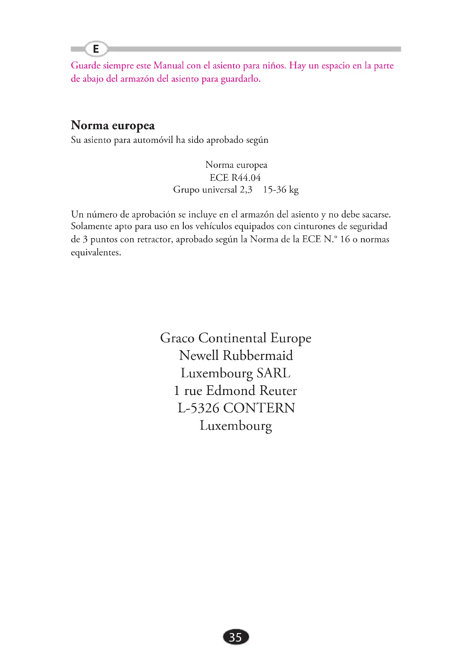 Guarde siempre este Manual con el asiento para niños. Hay un espacio en la parte de abajo del armazón del asiento para guardarlo. Norma europea Su asiento para automóvil ha sido aprobado según Norma europea ECE R44.04 Grupo universal 2,3 15-36 kg Un número de aprobación se incluye en el armazón del asiento y no debe sacarse. Solamente apto para uso en los vehículos equipados con cinturones de seguridad de 3 puntos con retractor, aprobado según la Norma de la ECE N.° 16 o normas equivalentes. Graco Continental Europe Newell Rubbermaid Luxembourg SARL 1 rue Edmond Reuter L-5326 CONTERN Luxembourg E36 AdvERTENCIAS NO INSTALE ni use este asiento para niños antes de leer y entender las instruc- ciones en este manual y en el manual del propietario de su vehículo. Es muy importante que el asiento portátil esté debidamente colocado con la parte de la falda del cinturón cruzando las guías rojas del cinturón debajo de los apoy- abrazos y el cinturón diagonal a través de las guías rojas del cinturón del hombro cuando se usa como un respaldo trasero o a través de la hebilla roja de posicio- namiento del cinturón del hombro cuando se lo usa como un asiento portátil sin respaldo. Asegúrese que la correa del cinturón no esté doblada. Tenga cuidado de ubicar e instalar el asiento portátil de modo que no quede atra- pado por un asiento movible o en la puerta del vehículo. NO USAR ESTE ASIENTO PARA NIÑOS DE MANERA CORRECTA AUMENTA EL RIESGO DE LESIONES GRAVES O LA MUERTE EN UNA PARADA REPENTINA O UN ACCIDENTE. NO use la funda para el asiento de otro fabricante en este asiento portátil. Consulte solamente a su representante de Graco para obtener repuestos. NO LO uSE en ninguna configuración que no se indique en las instrucciones. Según las estadísticas de accidentes, LOS NIÑOS ESTÁN MÁS SEGuROS CuANdO SE ENCuENTRAN SuJETOS CORRECTAMENTE EN LOS ASIENTOS TRASEROS dE LOS vEhÍCuLOS, EN vEZ dE LOS ASIENTOS dELANTEROS. Para vehículos con Airbag para los pasajeros del- anteros, refiérase al manual del propietario de su vehículo, además de estas instruc- ciones para la instalación del asiento para niños. NUNCA DEJE SOLO A SU NIÑO. NuNCA dEJE uN ASIENTO PARA NIÑOS SIN SuJETAR EN Su vEhÍCuLO. Un asiento para niños sin sujetar puede moverse y lesionar a los pas- ajeros en un giro brusco, una parada repentina o un accidente. Quítela o asegúrese que esté bien sujeta en el vehículo con el cinturón de seguridad. E37 ADVERTENCIAS NUNCA DEJE EQUIPAJE u otros objetos sin asegurar en un vehículo, podrían causar lesiones en caso de un accidente. REEMPLACE EL ASIENTO PARA NIÑOS DESPUÉS DE UN ACCIDENTE DE CUALQUIER TIPO. Un accidente puede causar daños ocul- tos en el asiento para niños. NO MODIFIQUE SU ASIENTO PARA NIÑOS ni use ningún accesorio o pieza proporcionados por otros fabricantes. NUNCA USE UN ASIENTO PARA NIÑOS AL QUE LE FALTEN PIEZAS O LAS TENGA DAÑADAS. NO use un cinturón de seguridad cortado, desgastado o dañado. EL ASIENTO PARA NIÑOS PUEDE CALENTARSE MUCHO SI SE DEJA AL SOL. El contacto con estas piezas puede quemar la piel de su niño. Siempre toque la superficie de cualquier pieza metálica o de plástico antes de colocar a su niño en el asiento para niños. NUNCA DE ESTE ASIENTO PARA NIÑOS a otra persona sin darles también este manual. NUNCA USE UN ASIENTO PARA NIÑOS DE SEGUNDA MANO ni un asiento para niños cuya historia no conoce. NUNCA USE ESTE ASIENTO PARA NIÑOS sin los apoyabrazos conectados a la base. NO USE puntos alternativos de sustento del peso que no se indiquen en estas instrucciones. Cuidado y mantenimiento