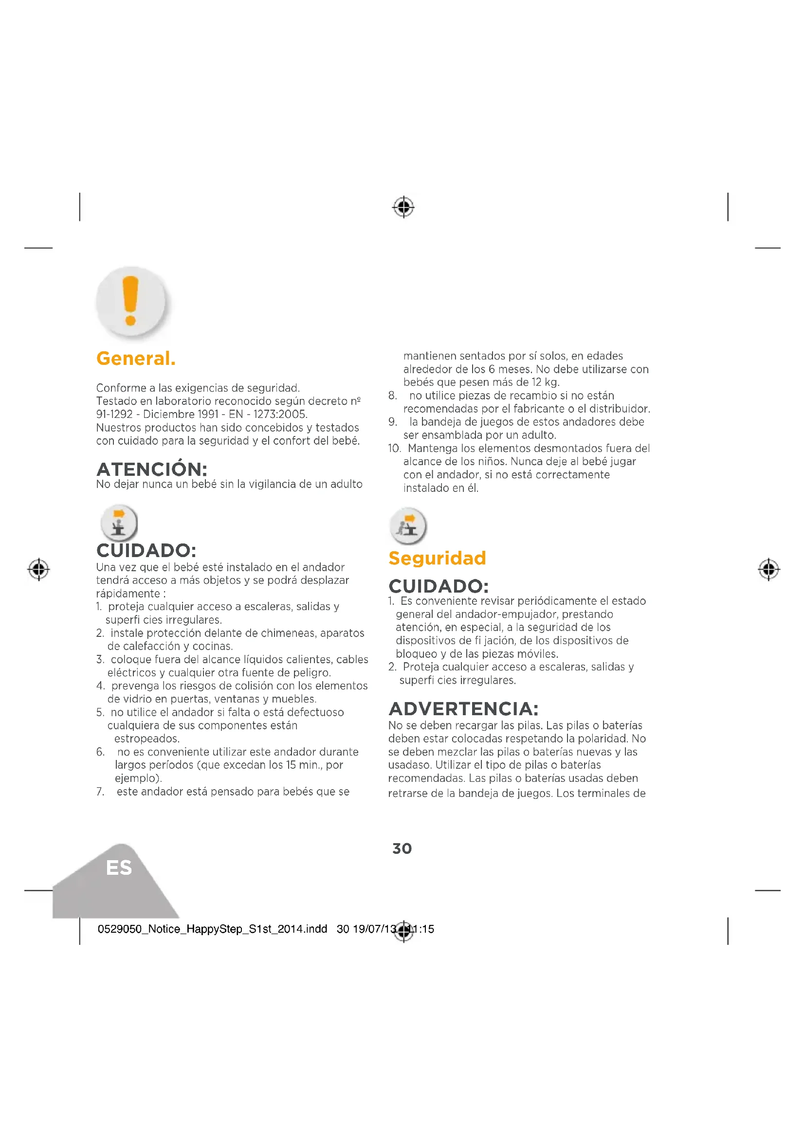 General. Conforme a las exigencias de seguridad. Testado en laboratorio reconocido según decreto nº 91-1292 - Diciembre 1991 - EN - 1273:2005. Nuestros productos han sido concebidos y testados con cuidado para la seguridad y el confort del bebé. ATENCIÓN: No dejar nunca un bebé sin la vigilancia de un adulto CUIDADO: Una vez que el bebé esté instalado en el andador tendrá acceso a más objetos y se podrá desplazar rápidamente :