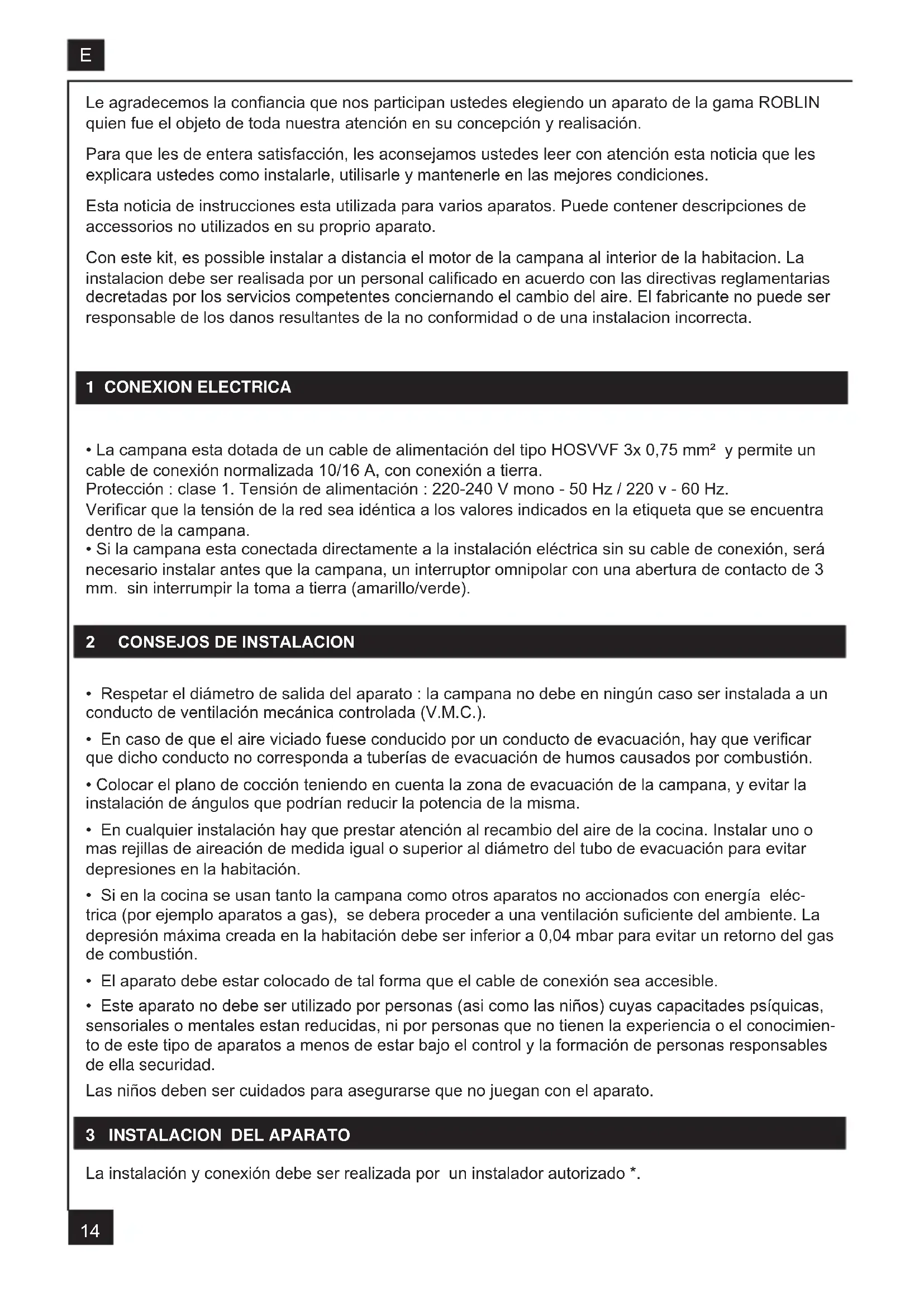 - La campana esta dotada de un cable de alimentación del tipo HOSVVF 3x 0,75 mm² y permite un cable de conexión normalizada 10/16 A, con conexión a tierra. Protección : clase 1. Tensión de alimentación : 220-240 V mono - 50 Hz / 220 v - 60 Hz. Vericar que la tensión de la red sea idéntica a los valores indicados en la etiqueta que se encuentra dentro de la campana.