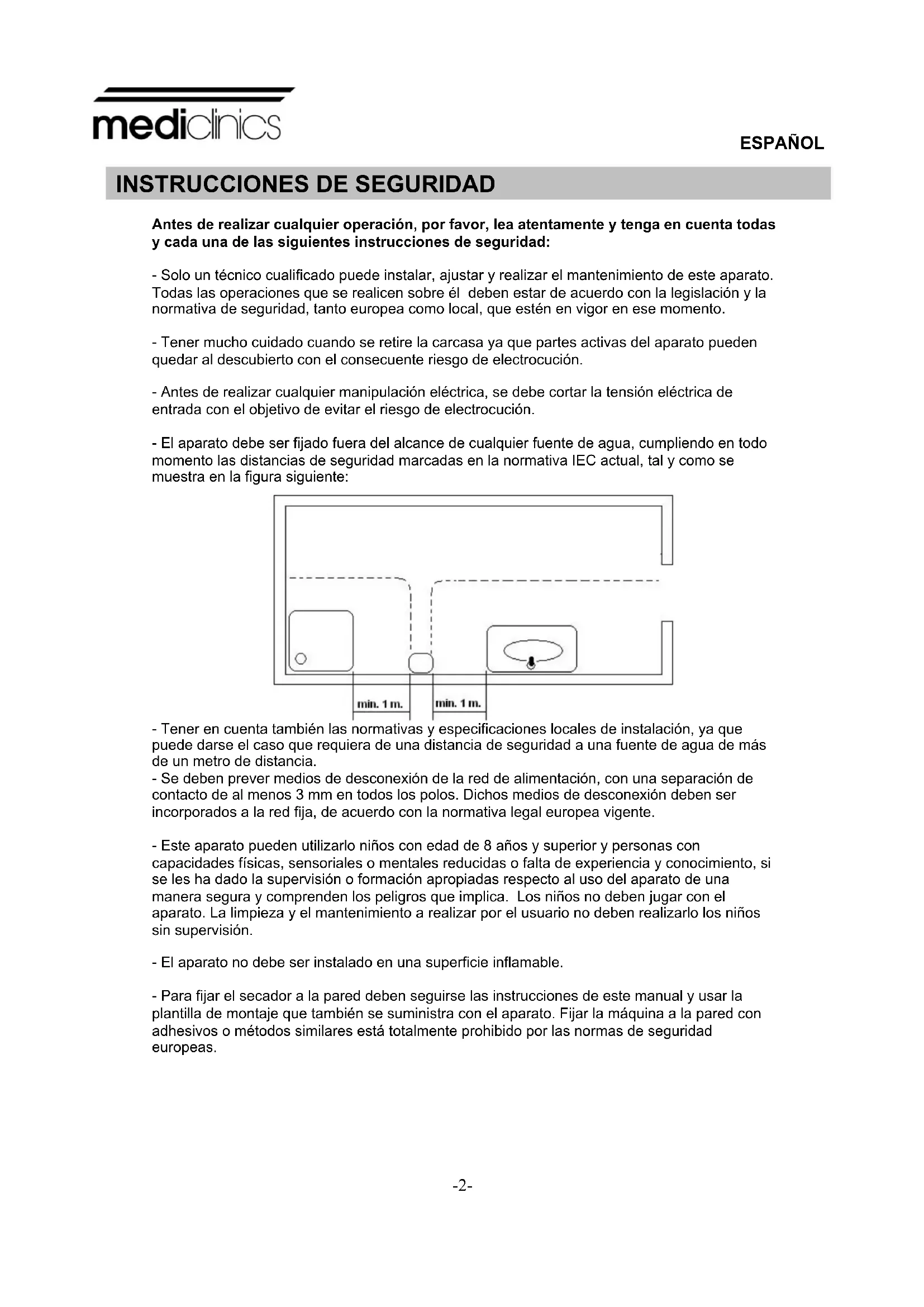 - Tener en cuenta también las normativas y especificaciones locales de instalación, ya que puede darse el caso que requiera de una distancia de seguridad a una fuente de agua de más de un metro de distancia. - Se deben prever medios de desconexión de la red de alimentación, con una separación de contacto de al menos 3 mm en todos los polos. Dichos medios de desconexión deben ser incorporados a la red fija, de acuerdo con la normativa legal europea vigente. - Este aparato pueden utilizarlo niños con edad de 8 años y superior y personas con capacidades físicas, sensoriales o mentales reducidas o falta de experiencia y conocimiento, si se les ha dado la supervisión o formación apropiadas respecto al uso del aparato de una manera segura y comprenden los peligros que implica. Los niños no deben jugar con el aparato. La limpieza y el mantenimiento a realizar por el usuario no deben realizarlo los niños sin supervisión. - El aparato no debe ser instalado en una superficie inflamable. - Para fijar el secador a la pared deben seguirse las instrucciones de este manual y usar la plantilla de montaje que también se suministra con el aparato. Fijar la máquina a la pared con adhesivos o métodos similares está totalmente prohibido por las normas de seguridad europeas.