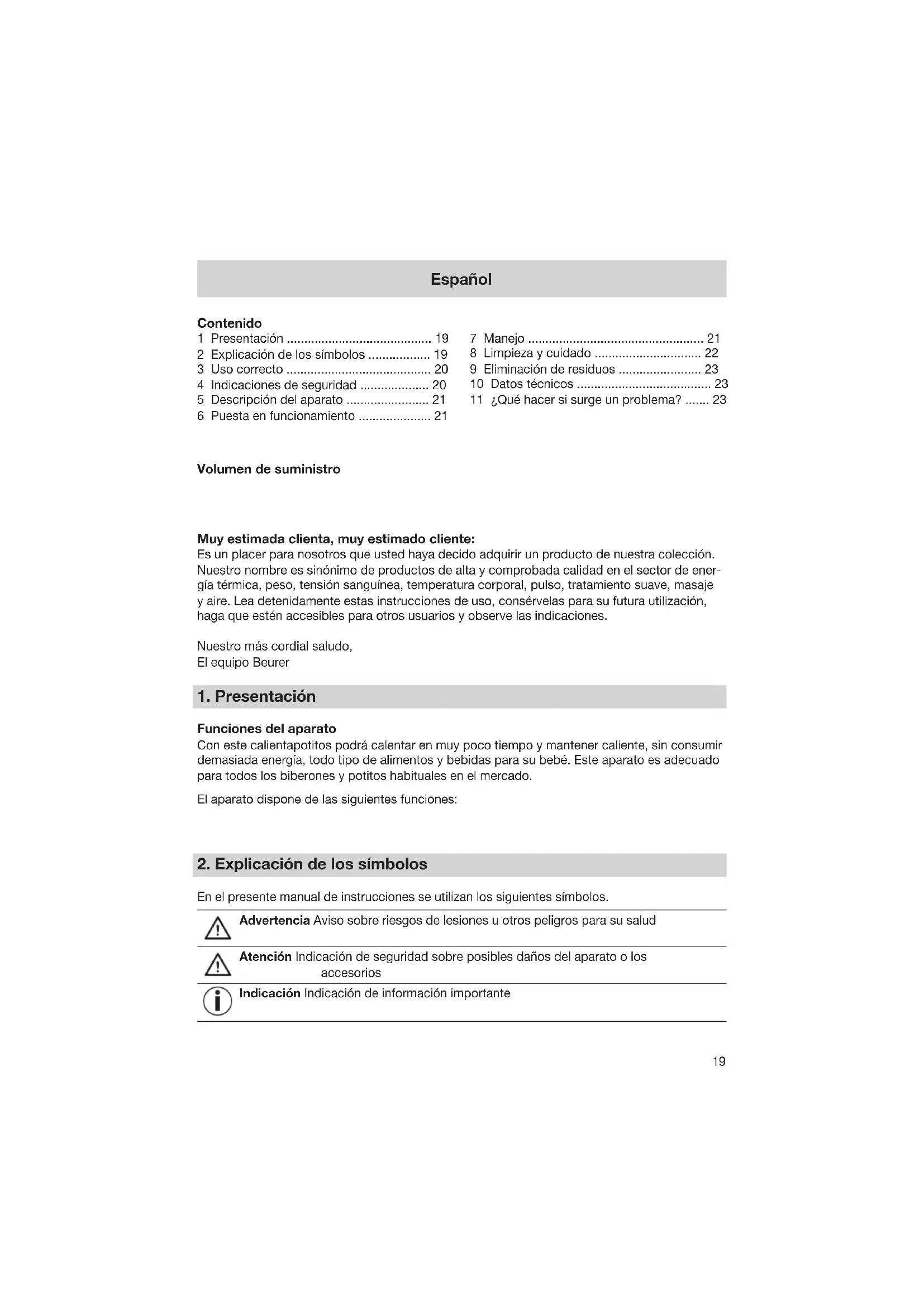 - En el presente manual de instrucciones se utilizan los siguientes símbolos. Advertencia Aviso sobre riesgos de lesiones u otros peligros para su salud Atención Indicación de seguridad sobre posibles daños del aparato o los accesorios Indicación Indicación de información importante Español Contenido 1 Presentación p. 19