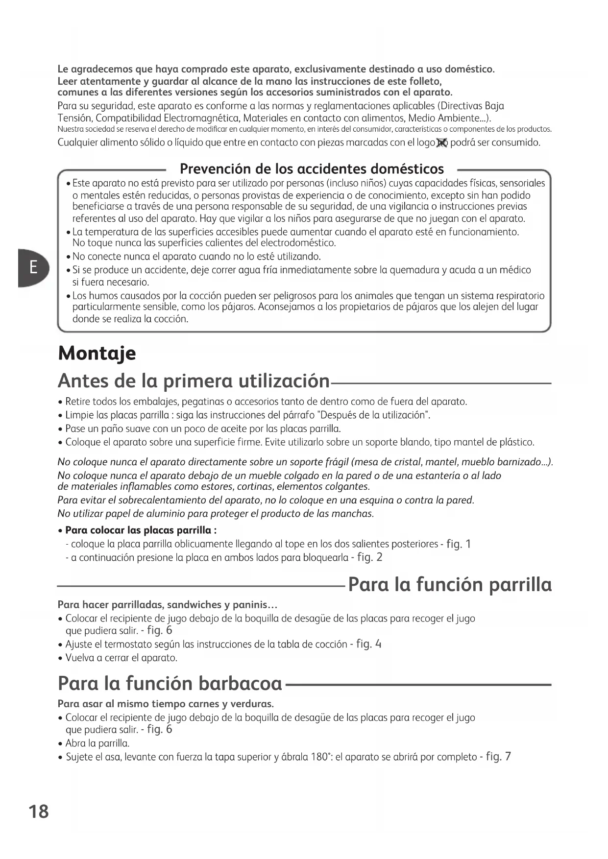- Para colocar las placas parrilla : - coloque la placa parrilla oblicuamente llegando al tope en los dos salientes posteriores - fig. 1 - a continuación presione la placa en ambos lados para bloquearla - fig. 2 Este aparato no está previsto para ser utilizado por personas (incluso niños) cuyas capacidades físicas, sensoriales o mentales estén reducidas, o personas provistas de experiencia o de conocimiento, excepto sin han podido beneficiarse a través de una persona responsable de su seguridad, de una vigilancia o instrucciones previas referentes al uso del aparato. Hay que vigilar a los niños para asegurarse de que no juegan con el aparato. La temperatura de las superficies accesibles puede aumentar cuando el aparato esté en funcionamiento. No toque nunca las superficies calientes del electrodoméstico. No conecte nunca el aparato cuando no lo esté utilizando. Si se produce un accidente, deje correr agua fría inmediatamente sobre la quemadura y acuda a un médico si fuera necesario. Los humos causados por la cocción pueden ser peligrosos para los animales que tengan un sistema respiratorio particularmente sensible, como los pájaros. Aconsejamos a los propietarios de pájaros que los alejen del lugar donde se realiza la cocción.