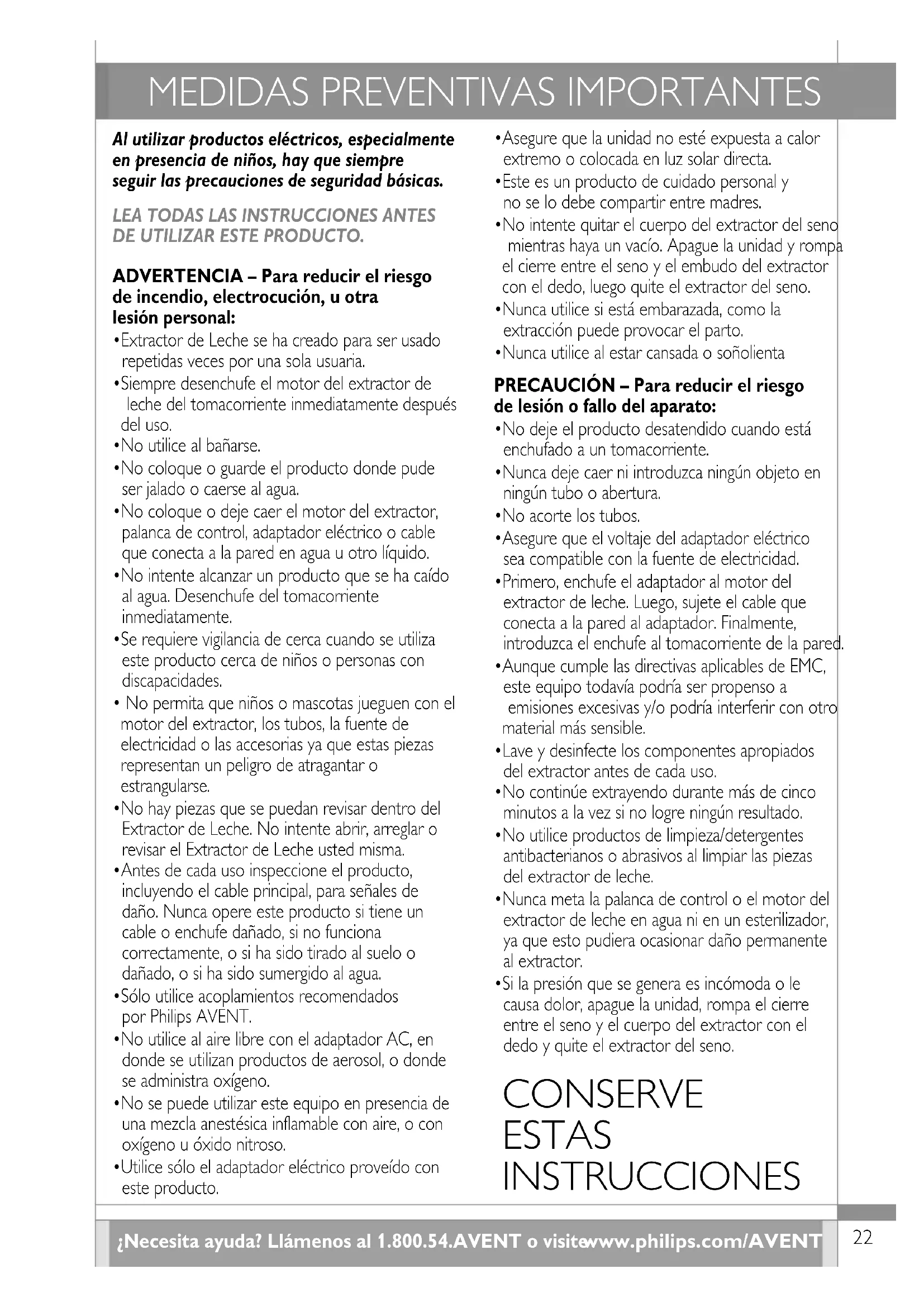 MEDIDAS PREVENTIVAS IMPORTANTESCojín de Pétalos Masajeadores cuenta con pétalos que se flexionan para suavemente masajear la areola. Esto tiene la intención de ayudar a estimular un flujo de leche rápido y natural. Control de Memoria de un Solo Toque está al alcance de los dedos. Puede parar, empezar o ajustar los niveles de velocidad y succión sin quitar la mano del extractor. Memoria Electrónica aprende de usted. Simplemente empiece un ritmo de bombeo cómodo, oprima un botón, y Extractor de Leche Electrónico Doble lo automatiza. Conveniencia para extraer, conservar y alimentar del Sistema de Alimentación Natural Philips AVENT. Los productos se combinan para que nunca tenga que transferir leche entre contenedores. Ultra Cómodo, Silencioso y Eficiente, haciéndolo fácil el continuar regalándole a su bebé las ventajas de la leche materna. ¡Felicidades! Muy pronto descubrirá lo que hace este Extractor de Leche Electrónico Doble tan único para usted. Extractor de Leche ha sido diseñado con una memoria electrónica que aprende y luego continúa su ritmo de bombeo suave. Le da el control completo sobre su comodidad, lo cual significa que extraer leche con Extractor de Leche Electrónico Doble siempre se sentirá natural y completamente normal. Contenido: Extracción Eléctrica (Sencilla y Doble) Guía de Piezas del Extractor de Leche Electrónico Doble 20-21 Medidas preventivas importantes 22 Desmontando el Extractor de Leche Electrónico 24 Limpiando y Desinfectando el Extractor de Leche 25 Preparándose para una Extracción 26-27 Montando los Cuerpos del Extractor de Leche 28-29 Conectando los componentes Electrónicos 30-31 Extrayendo Leche con el Extractor de Leche 32-33 Manteniendo las Piezas Limpias y Compactas para Viajes 34 Conservando la Leche Materna Extraída 35-36 Guía de Solución de Problemas 37 Especificaciones Técnicas 38 Garantía Limitada 38 ¿Necesita ayuda? Llámenos al 1.800.54.AVENT o visite www.philips.com/AVENT