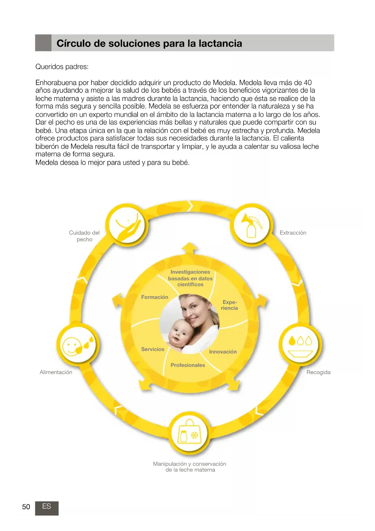 Círculodesolucionesparalalactancia Queridos padres: Enhorabuena por haber decidido adquirir un producto de Medela. Medela lleva más de 40 años ayudando a mejorar la salud de los bebés a través de los beneficios vigorizantes de la leche materna y asiste a las madres durante la lactancia, haciendo que ésta se realice de la forma más segura y sencilla posible. Medela se esfuerza por entender la naturaleza y se ha convertido en un experto mundial en el ámbito de la lactancia materna a lo largo de los años. Dar el pecho es una de las experiencias más bellas y naturales que puede compartir con su bebé. Una etapa única en la que la relación con el bebé es muy estrecha y profunda. Medela ofrece productos para satisfacer todas sus necesidades durante la lactancia. El calienta biberón de Medela resulta fácil de transportar y limpiar, y le ayuda a calentar su valiosa leche materna de forma segura. Medela desea lo mejor para usted y para su bebé. Extracción Recogida Manipulación y conservación de la leche materna Alimentación Cuidado del pecho Innovación Investigaciones basadas en datos científicos Profesionales Servicios Expe- riencia Formación51ES Descripcióndelproducto Encendido / Apagado Selección Conrmación